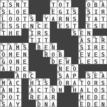 ACROSS 1. Is not 5. Small child 8. Chief or king in Benin or Nigeria 11. A type of plum 12. Armor plate that protects the chest 14. Title for a knight 15. Plunders 17. Tall tales 18. Make lace 19. Center 21. Eastern Standard Time (abbr.) 22. Compass dir. 23. Definite Article 24. Big collection agency 25. Elected rep. 27. Teat (slang) 28. SW Saudi Arabia district 31. Scottish caps 35. Benjamin's nick name 37. The founder of a family 38. Presage 39. Director Reiner 41. Nights before holidays 42. Went 43. Morning condensation 45. For fear that 46. Assistant 47. Modern: prefix 49. Curve 51. Plant excrement 52. Ocean 55. Apple computer (short form) 57. Part of HMS, perhaps 60. Speakers 62. Cuckoo 63. NE Massachussets city 65. Rings 66. Cooking vessel 67. Rump 68. Ancient Persian 69. Declare 70. Heredity factor (abbr.) 71. Paradise DOWN 1. Small island 2. Make a splashing sound 3. Trap for birds or small mammals 4. False hair 5. Beverage made from leaves 6. Legendary monster 7. Metal containers 8. Clearly or manifestly demonstrative 9. Prejudice 10. Johnson of "Laugh-In" 13. Fast planes 16. In a ____ (agitated or irritated) 17. Last 20. Baby bed with high sides 26. Artist's stand 29. Angers 30. Take ten 31. Ancient Roman robe 32. Mine, in Marseilles 33. Ananias' fault 34. Contemptuous expression 36. Lower and raise head in agreement 40. Gillaume's butler role 44. Erode 48. Brightly colored fish 50. Burn to charcoal 52. Having a sole or soles 53. Wear away 54. NE Netherlands city 55. Atlas contents 56. Small Philippine buffalo 58. On the rocks 59. Comedian Laurel of Laurel & Hardy 61. Docile 64. Mouth or opening