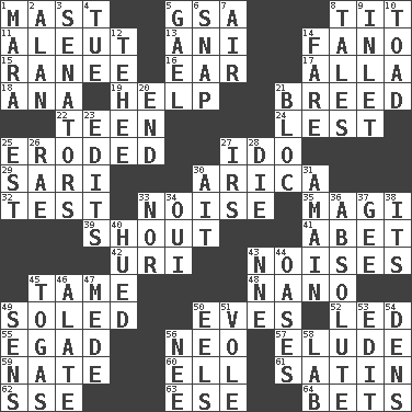 ACROSS 1. Vertical spar for supporting sails 5. Girls' org. (abbr.) 8. Teat (slang) 11. Native American of Southwest Alaska 13. Black tropical American cuckoo 14. Papal veil 15. Indian princess (variant) 16. Ewer handle 17. Silent film actress Nazimova 18. Santa ___, CA 19. Assist 21. A special lineage 22. Adolescent 24. For fear that 25. Worn away 27. Wedding promise 29. Indian skirt 30. N. Chile seaport 32. Trial 33. Annoying sound 35. Wise men 39. Yell 41. Collude with 42. RI univ. 43. Annoying sounds 45. Not wild 48. Billionth: prefix 49. Having a sole or soles 50. Nights before holidays 52. Directed 55. Mild oath 56. Modern: prefix 57. Evade 59. Nathan's nickname 60. Pipe bend 61. Smooth fabric 62. Compass dir. 63. Compass dir. 64. Wagers DOWN 1. Hindu Mythology: god of death 2. Actor Alda or Thicke 3. Legislators 4. Third day of the wk. 5. Highlander 6. Fastener 7. Atmosphere 8. Stories 9. An arm off of a larger body of water 10. Frog relative 12. Giggle 14. Conductor's collection 20. Conclude 21. Group of countries in special alliance 23. Prepares for publication 25. Eastern Standard Time (abbr.) 26. Actress Charlotte 27. Big collection agency 28. Expire 30. Small island 31. At full speed 33. And not 34. Fr. "Yes" 36. Utter; complete 37. Unit of force equal to gravity 38. ___ a Wonderful Life 40. Became colored 43. Compass dir. 44. Fertile tracts in a desert 45. Ancient Roman robes 46. Having winglike extensions 47. Ancient Persian 49. Elected reps. 50. Snakelike fish 51. Short-tailed, large-bodied rat 53. Prepare for publication 54. Lairs 56. Born 58. Experiment locale