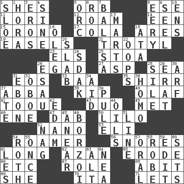 ACROSS 1. "______ My Girl" (Turtles hit) 5. Globe 8. Compass dir. 11. Australian parrot (variant) 12. Wander 14. Car or cant ending 15. U. of Maine site 17. Root beer relative 18. Ancient Greek god of war 19. Artist's stands 21. Trinitrotoluene 23. Raised railways 25. Portico 26. Mild oath 27. Cleo's killer 28. Ocean 31. Greek goddess of the dawn 33. Sound made by sheep 35. Bake eggs in their shells 37. Swedish rock group 38. Monetary unit of Laos 40. Norwegian king 41. Woman's close-fitting hat 43. Superhero pair 45. Was introduced to 46. Compass dir. 47. Small moist lump or mass 50. _ and Stitch 52. Billionth: prefix 53. Biblical high priest 54. Nomad 56. Sounds asleep 61. Yearn 62. Muslim summons to prayer 65. Wear away 66. And so on (abbr.) 67. Hero or heavy, e.g. 68. "This won't hurt ____!" 69. A female animal or person 70. Call ___ day 71. Allows DOWN 1. A type of plum 2. Israeli folk dance 3. Greek god of love 4. Trig term 5. The grampus (Milton) 6. Friend of Pooh 7. Greek mezzo-soprano Agnes 8. Suggestive of the supernatural 9. Sew up the eyelids of hawks and falcons 10. Followers of ems 13. Shops 16. Cassini of fashion 18. _ moment's notice (2 wds.) 20. Broad, flat, thick piece 22. I made a mistake 24. Neighbor of Neb. 26. He sold his birthright 28. Drop; flow; fall 29. Part of Q.E.F. 30. Sandy's bark 31. Inky black, to poets 32. Mitch Miller's instrument 34. Help 36. Same (prefix) 37. Had dinner 39. Whine 42. Dutch treat 44. Petroleums 48. Approach 49. Russian wolfhound 51. Actor's bit 52. Tired old horse 54. Writer of Portnoy's Complaint (1969) 55. Single time 57. Spoken 58. Loose flowing garment 59. Prepare for publication 60. Arranges properly for use 61. French article 63. The first octave above the treble staff 64. Teachers' org.