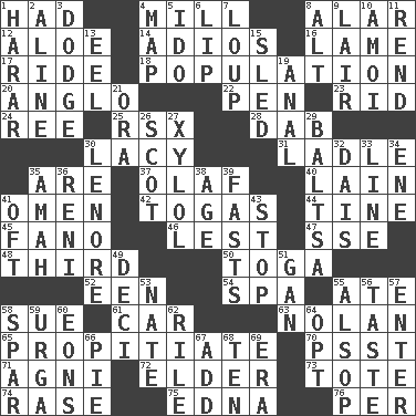 ACROSS 1. Possessed 4. Place where flour is made 8. Having or resembling wings 12. Medicinal plant 14. Goodbye (Sp.) 16. Unable to walk 17. Travel on an animal 18. Census information 20. White American of non-Hispanic descent 22. Animal enclosure 23. To free from 24. To riddle 25. Acura sports coupe 28. Apply (a substance) by light strokes 30. Made of lace 31. Dipping utensil 35. "We ___ not amused" (Victoria) 37. Norwegian king 40. (Had) reclined 41. Sign of things to come 42. Ancient Roman robes 44. Prong on a fork 45. Papal veil 46. For fear that 47. Compass dir. 48. One of three equal parts 50. Ancient Roman robe 52. Car or cant ending 54. Health resort 55. Had dinner 58. Take to court 61. 4-wheeled motor vehicle 63. Pitcher Ryan 65. Conciliate 70. Inconspicuous attention getter 71. Hindu god of fire 72. A person who is older than you are 73. Carry 74. Raze (variant) 75. Pulitzer Prize-winning author Ferber 76. For each DOWN 1. Ethiopian city, capital of Harari 2. Place in a line 3. Evade 4. Atlas unit 5. Wedding promise 6. Mouth edge 7. Central Nebraska county 8. The first octave above the treble staff 9. Den 10. Mine, in Marseilles 11. Tear apart 13. Snakelike fish 15. Downhill vehicle 19. Of or related to the anus 21. Mouth or opening 26. Native of Scotland 27. Xylene (variant) 29. Greek mezzo-soprano Agnes 30. Poe poem 32. Raised platform 33. Actor's bit 34. Compass dir. 35. Nursemaid 36. Painter Guido (1575-1642) 38. Personal question 39. Goes without food and/or water 41. Often (poetically) 43. Halt 49. Tenth: prefix 51. Separate the seeds from cotton 53. Nathan's nickname 55. Columnist Joseph or Stewart 56. Clothes sense 57. Keyboard key 58. Practice fight 59. Capital and largest city of Mongolia 60. Immeasurably long periods of time 62. Cause heat under the collar 64. Elect 66. Sliced dessert 67. Say or write further 68. Nine, plus one 69. Epoch