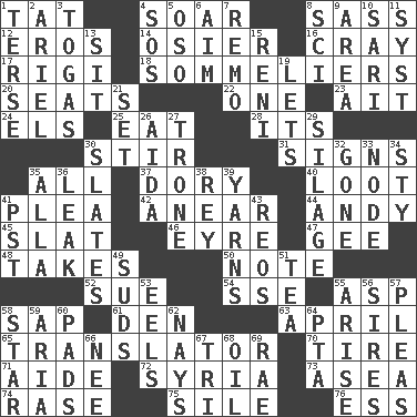 ACROSS 1. Make lace 4. Fly high 8. Backtalk 12. Greek god of love 14. Flexible twig of a willow tree 16. Supercomputer manufacturer 17. Swiss mountan, "Queen of the Mountains" 18. Wine waiters 20. Theater features 22. Single 23. Small island 24. Raised railways 25. Erode 28. It is 30. Commotion 31. Omens 35. 100% 37. Rowboat 40. Spoils 41. Entreaty 42. Approach 44. Actor Griffith 45. Narrow board 46. Jane of fiction 47. Unit of force equal to gravity 48. Receives possession of 50. Short letter 52. Take to court 54. Compass dir. 55. Viper 58. Plant excrement 61. Lair 63. Showery time 65. Interpreter 70. Hoop that covers a wheel 71. Helper 72. Damascus' land 73. Toward the sea 74. To erase 75. Drop; flow; fall 76. Curvy letter DOWN 1. Laconic 2. Satellite of Uranus 3. Ancient Roman robes 4. Mayday 5. Bear (Spanish) 6. Direct toward a target or goal 7. San ____ (Riviera town) 8. _-fi 9. Type of rug 10. Indian skirt 11. System (abbr.) 13. Be seated 15. Painter Guido (1575-1642) 19. Allows 21. Put into a specified state 26. Opera by Verdi 27. Marketplace scale 29. Fodder prepared in a silo 30. Chalkboards 32. Went 33. Connecting point 34. Filthy place 35. Silent film actress Nazimova 36. Path through which fluid escapes 38. Marina Del _, California 39. Tall tales 41. Pacific Standard Time (abbr.) 43. Vintage cars 49. Soap bubbles 51. Beverage made from leaves 53. Snakelike fish 55. Originate 56. Titles for men of rank and authority 57. Entreaties 58. Play the lead 59. Roberta Peters solo 60. Writing tablets 62. Negative votes 64. Parent Teacher Association (abbr.) 66. Born 67. Three (prefix) 68. Lubricate 69. Actress Charlotte