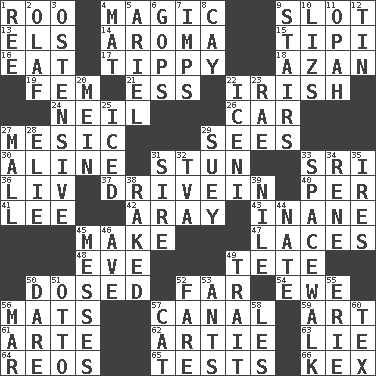 ACROSS 1. Friend of Pooh 4. Mysterious quality of enchantment 9. Position in a hierarchy or organization 13. Raised railways 14. Scent 15. Native american tent (variation) 16. Consume 17. Likely to tip or tilt 18. Muslim summons to prayer 19. Opposite of masc. 21. Curvy letter 22. From or relating to Ireland 24. Famous astronaut Armstrong 26. Auto 27. Of or pertaining to a meson 29. Perceives with the eye 30. Place in a line 31. Make senseless or dizzy 33. Indian title of respect (Mr.) 36. 54 in ancient Rome 37. Popular '50s hangout 40. For each 41. Area sheltered from the wind 42. Like ___ of sunshine 43. Lacking in sense or substance 45. Create 47. Shoestrings 48. Night before a holiday 49. Wig 50. Administered medicine 52. At a great distance 54. She-sheep 56. Floor protectors 57. Lessep's creation 59. Tate display 61. Johnson of "Laugh-In" 62. Nick name for Arthur 63. Whopper 64. Vintage cars 65. Trials 66. A weed DOWN 1. To riddle 2. Norwegian king 3. Clearly or manifestly demonstrative 4. Floor covering 5. Satellite of Uranus 6. Republicans 7. Naughty children 8. Island 9. Flight of steps 10. Belonging to Elizabeth 11. Brightly colored fish 12. Metal container 20. Chow _ 22. Ancient Celtic tribe of eastern Britain 23. Actress Charlotte 25. On the rocks 27. Promenade 28. Writer Wiesel 29. Chop _ 31. The founder of a family 32. Federal power corp. 33. High altitude stroll 34. French philosopher Descartes 35. Angers 38. Swept the length of 39. The longest river in the world 44. Nathan's nickname 45. Makes clutter 46. "___ Maria" 49. Distinguishing feature 50. Have the gumption 51. Von Bismarck 52. Conductor's collection 53. Pismires 55. One of the Great Lakes 56. Make imperfect 57. Feline 58. French article 60. John Ritter's dad