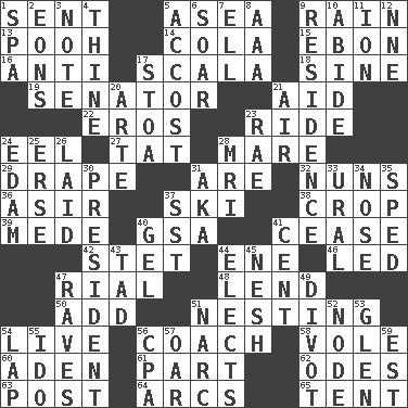 ACROSS 1. Transmitted 5. At sea 9. Precipitation 13. "Silly old bear" 14. Root beer relative 15. Inky black, to poets 16. Opposed to 17. Any of the three canals of the cochlea 18. Trig term 19. Elected representative 21. Assist 22. Greek god of love 23. Travel on or in a vehicle 24. Snakelike fish 27. Make lace 28. Female horse 29. Window treatment 31. "We ___ not amused" (Victoria) 32. Religious women 36. SW Saudi Arabia district 37. What Jean-Claude Killy likes to do 38. Riding implement 39. Ancient Persian 40. Girls' org. (abbr.) 41. Stop 42. Proofreading order 44. Compass dir. 46. Directed 47. Monetary unit of Yemen 48. Grant temporary use of 50. Increase 51. Nestling 54. Not recorded 56. Team commander 58. Short-tailed, large-bodied rat 60. Arabian gulf 61. Role in a play 62. Lyric poems 63. Mail 64. Arches 65. Portable shelter DOWN 1. Health resort 2. Immeasurably long periods of time 3. Brief written record 4. One or ones belonging to thee 5. Buttonhole 6. Fly high 7. Pipe bend 8. American Automobile Association (abbr.) 9. Dwelling 10. Stay 11. Electrically charged atom 12. Compass dir. 17. Portico 20. Johnson of "Laugh-In" 21. Atmosphere 23. Actress Charlotte 24. Dutch treat 25. Celtic language 26. Put down 28. Medical imaging device (abbr.) 30. Elected leader of a country 31. Alias (abbr.) 33. Mountain range 34. Sense of smell 35. Broke a traffic law 37. Fast jet (abbr.) 40. Set 41. Penny 43. Bit 44. Opts 45. Soft 47. All-night dance parties 49. A piece of turf (Scot.) 51. Drug cop 52. Connecting point 53. Small, secluded valley 54. Pet locale 55. Wedding promise 56. Numbers guy (abbr.) 57. Rowing implement 59. Eastern Standard Time (abbr.)