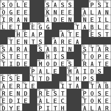 ACROSS 1. Not divided or shared with others 5. Backtalk 9. 23rd letter of the Greek alphabet 12. Double curve, resembling the letter S 13. Leg joint 14. Actor Alda or Thicke 15. SW Asia republic 16. An important port of Yemen 17. Famous astronaut Armstrong 18. Allow 19. Oval reproductive body of a fowl 21. Eating place 22. Pile 24. Had dinner 26. Eastern Standard Time (abbr.) 27. Portable shelters 28. Length times width 29. "Two Mules for Sister ____" 30. Unit of acoustic absorption 32. Play the lead 36. Proofreading order 37. Part of HMS, perhaps 38. Drink excessively 39. Periodic rise and fall of the sea level 40. Methods 42. Assign a rank or rating to 43. Diluted with white 44. Women servants 46. Compass dir. 49. It would 50. Naughty children 51. Nest on high 53. Call ___ day 54. Bar bill 57. Tear apart 58. Respite 61. Airs 62. Singer Brickell 63. Actor Baldwin 64. Casino tip 65. Color 66. Essential or central part 67. Having or resembling wings DOWN 1. The visible part of the earth's surface 2. Legendary monster 3. Resembling or made to resemble leather 4. Car or cant ending 5. Heroin 6. Plus 7. Observe 8. Elected rep. 9. Military trainee 10. Moves on water 11. An arm off of a larger body of water 14. Santa ___, CA 19. Ingest 20. Global Positioning Systems (abbr.) 21. Afternoon social gathering 23. Related on the mother's side 24. Ascend 25. Nine, plus one 27. Jacques of French films 28. Remain 29. Fast jet (abbr.) 31. Hold, grip (Informal) 32. Long narrow piece of something 33. Inedible or poisonous agaric 34. Flats, for short 35. Portuguese money of account (variant) 40. Floor protector 41. Stricken, poetically 43. Sliced dessert 45. Housemaid (var.) 46. Having ears or earlike features 47. Shabby and untidy 48. Bert's buddy 52. Binary compound 53. Hankering 55. "____ silly question..." 56. Fermented drink made from hops 58. Strike 59. Biblical high priest 60. Put into a specified state 61. Parent Teacher Association (abbr.)