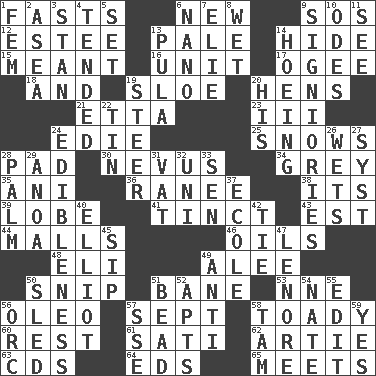 ACROSS 1. Goes without food and/or water 6. ___ Haven, CT 9. Mayday 12. First name in cosmetics 13. Light colored 14. Flintstone garb 15. Intended 16. A single undivided whole 17. Double curve, resembling the letter S 18. Added to 19. _ gin 20. Coop moms 21. Singer James 23. One more than two 24. Singer Brickell 25. Frozen precipitation (plural) 28. Groovy apt. 30. Mole, birthmark 34. Jennifer or Joel 35. Cuckoo 36. The wife of a rajah (variant) 38. It is 39. Ear part 41. A color or tint 43. Eastern Standard Time (abbr.) 44. Shopping centers 46. Petroleums 48. Connecticut Ivy Leaguer 49. Toward shelter 50. Clip 51. Object of repulsion 53. Compass dir. 56. Butter sub 57. Back-to-school mo. 58. Sycophant 60. Relief 61. Suttee (variant) 62. Nick name for Arthur 63. Music discs 64. Begley and Asner 65. Confronts DOWN 1. Opposite of masc. 2. Toward the sea 3. Comedian Laurel of Laurel & Hardy 4. Looked after 5. Arrange properly for use 6. Billionth: prefix 7. Writer Wiesel 8. Dripping 9. Seigniories (variant) 10. Lyric poems 11. Observe 13. Monetary unit of Botswana 14. Weeding 19. Guide 20. Part of HMS, perhaps 22. Metal container 24. The property of being fit to eat 26. Moistens 27. System (abbr.) 28. Inside of hand 29. Small Philippine buffalo 31. Large container 32. University (slang) 33. Elected rep. 37. Learning spot: Fr. 40. American author Paul (1891-1958) 42. Make a knot 45. Small drink 47. Poe poem 49. Opposed to 50. Downhill vehicle 51. Necklace unit 52. Tenement units (abbr.) 54. Nathan's nickname 55. Prepare for publication 56. The grampus (Milton) 57. Compass dir. 58. Scottish cap 59. Affirmative reply