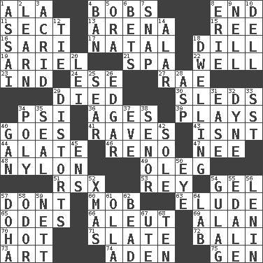 ACROSS 1. Chicken ___ king 4. Moves up and down 8. Conclude 11. Religious group 13. Sports stadium 15. To riddle 16. Indian skirt 17. Relating to or accompanying birth 18. Deli pickle 19. Satellite of Uranus 21. Health resort 22. Not ill 23. Working for oneself (abbr.) 24. Compass dir. 27. Actress Charlotte 29. Passed on 30. Bobsleighs 34. Air pressure measure (abbr.) 36. Matures 39. Frolics 40. Leaves 41. All-night dance parties 43. Is not 44. Having winglike extensions 46. Former U.S. Attorney General Janet 47. Born 48. Thermoplastic polyamide 49. Cassini of fashion 51. Acura sports coupe 53. Marina Del _, California 54. Set 57. Do not 60. Crowd into 63. Evade 65. Lyric poems 66. Eskimo relative 69. ____ Jay Lerner 70. Being at a high temperature 71. Chalkboard 72. Indonesian resort city 73. Nonscientific branch of learning 74. Arabian gulf 75. Commissioned military rank (abbr.) DOWN 1. Slender Brazilian palm 2. Memorize 3. Sour-tasting 4. Prohibit 5. Mouth or opening 6. Wagers 7. Fastener 8. 4th largest of the Great Lakes 9. 1994 drama film starring Jodie Foster 10. Small valley 12. Neckwear 14. Having or resembling wings 18. Residence 20. Flowery wreath 25. Shrivel 26. _ Allan Poe 28. Viper 29. What propaganda does 31. Relaxation 32. Centimeter-gram-second unit of force 33. Fast jet (abbr.) 34. Many (prefix) 35. Lick closed 37. First lady 38. Sir (Sp.) 40. Separate the seeds from cotton 42. Flatfish 45. Followers of ems 50. Sight organ 52. Dec. holiday 54. Russian prison camp 55. Peak District village in England 56. Soviet premier 1918-24 57. Capital of the state of Qatar 58. Aroma 59. Remaining after all deductions 61. Water jar 62. Necklace unit 64. Experiment locale 67. Shoshoni 68. "___ Little Indians"