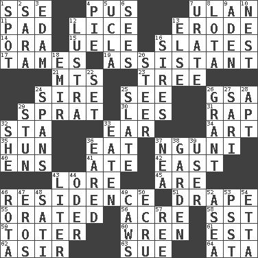 ACROSS 1. Compass dir. 4. Ichor 7. Uhlan (variant) 11. Groovy apt. 12. Louse (plural) 13. Eat (away) 14. Mouth or opening 15. Ubangi River tributary 16. Chalkboards 17. Makes less strong or intense 19. Helper 21. Mountains (abbr.) 23. Woody plant 24. Father 25. Perceive with the eye 26. Girls' org. (abbr.) 29. Small fatty European fish 30. French article 31. Strike 32. R.R. building 33. Hearing organ 34. Tate display 35. Attila the _ 36. Consume 37. Group of southern Bantu languages 40. Followers of ems 41. Had dinner 42. 90 degrees 43. Old wives' tales, e.g. 45. "We ___ not amused" (Victoria) 46. Dwelling 51. Window treatment 55. Spoke pompously 56. 1/640 square mile 58. Fast jet (abbr.) 59. Carrier 60. Songbird 61. Eastern Standard Time (abbr.) 62. SW Saudi Arabia district 63. Institute legal proceedings 64. _ moment's notice (2 wds.) DOWN 1. Specific locale 2. "Two Mules for Sister ____" 3. Dutch treat 4. Sliced dessert 5. Southern CA. univ. 6. Observes 7. A salt of uric acid 8. Globular water bottle used in Asia 9. Arabian gulf 10. Egg locale 12. A period of five years 13. Otherwise 16. Begets 18. Independent ruler or chieftain 20. Guide 22. Arrange properly for use 24. Connects, as a bridge 25. Schedule 26. Monetary aid 27. Indian skirt 28. Fitting 29. Astound 32. A female animal or person 33. Consumed 36. Having ears or earlike features 37. Teachers' org. 38. Place where plants grow 39. One who makes use of a thing 43. 61 cubic inches 44. River in Europe 46. Roll call or roster of names 47. Greek god of love 48. Suttee (variant) 49. Crow sounds 50. Shade of tan 52. At sea 53. Inconspicuous attention getter 54. Singer James 57. To riddle