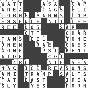 ACROSS 1. Electrical Unit 5. White ___ sheet 8. Head covering 11. Length times width 12. Labels 14. Connecticut Ivy Leaguer 15. Singer Mel 17. Entertaining tales 18. Trim (branches) 19. Core 21. Small island 22. Area sheltered from the wind 23. To sift 24. Two (Sp.) 25. Plant excrement 27. Baseball player Mel 28. Burn to charcoal 31. Scottish caps 35. Snakelike fish 37. Heavy book 38. Sign of things to come 39. Actress Charlotte 41. Washington bills 42. Went 43. Pacific Standard Time (abbr.) 45. Monthly bill 46. Assistant 47. Small bed 49. Curve 51. Had dinner 52. Ocean 55. Apple computer (short form) 57. Frozen water 60. Thinks logically 62. Black tropical American cuckoo 63. _____ steamer (cargo ship) 65. Table seasonings 66. Make lace 67. Compass direction 68. The content of cognition 69. Insidious 70. It is so 71. Dormintory (informal) DOWN 1. Wetness 2. Came up 3. Laconic 4. Docile 5. _ moment's notice (2 wds.) 6. "Two Mules for Sister ____" 7. Hindu god of fire 8. Portable communications device 9. _ vera 10. Corncob 13. Fast planes 16. Inside; within (prefix) 17. Last past 20. ____ d'Azur (French Riviera) 26. Thespian 29. So be it 30. Take ten 31. Ancient Roman robe 32. Mine, in Marseilles 33. Ananias' fault 34. Contemptuous expression 36. Pet locale 40. Fortification 44. Carry 48. Beverages made from leaves 50. Quote 52. Twentieth part of a lira 53. Keyboard key 54. Indian state 55. Floor protectors 56. Of or related to the anus 58. Supercomputer manufacturer 59. Comfort 61. Stated 64. Mountains (abbr.)