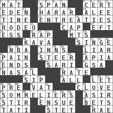 ACROSS 1. Floor protector 4. Connect, as a bridge 8. Sure thing 12. Locale of original sin 14. Ethiopian city, capital of Harari 16. Toward shelter 17. Prong on a fork 18. Pleas 20. Cowboy competition 22. Head covering 23. Bank Draft (abbr.) 24. Curvy letter 25. Reproach for some lapse or misdeed 28. Mountains (abbr.) 30. Polynesian shrub of the pepper family 31. Burn superficially 35. Basketball assoc. 37. Lodging establishments 40. One who doesn't tell the truth 41. Ache 42. Navigate 44. Capital of Western Samoa 45. Extremities 46. Indian skirt 47. Girls' org. (abbr.) 48. Rhinal 50. Pace 52. Small drink 54. 100% 55. Allow 58. Before (prefix) 61. Large container 63. Garlic unit 65. Wine waiters 70. SW Saudi Arabia district 71. Commotion 72. Take place subsequently 73. Antes 74. Jacques of French films 75. Proofreading order 76. Actress Charlotte DOWN 1. Distance measurement (Brit.) 2. Goodbye (Sp.) 3. Watches over 4. A female animal or person 5. Baking dish 6. Tate display 7. Drug cop 8. Feline 9. Writer Wiesel 10. Coral ridge 11. Trial 13. Born 15. 480, 500 or 516 sheets of paper 19. Flats, for short 21. Mouth or opening 26. Advice 27. Leg coverings 29. Fodder prepared in a silo 30. Sunflower state 32. Cuts off 33. Greek goddess of the earth (variant) 34. Epoch 35. Grandmother 36. Auction offers 38. Teachers' org. 39. Father Junipero _ 41. Fenced enclosure 43. Monetary unit of Yemen 49. Not recorded 51. Affectionate concern, for short 53. Diluted with white 55. Failure 56. Webber/Rice musical 57. Laconic 58. Inconspicuous attention getter 59. Roll call or roster of names 60. Give off 62. Airtight sealed metal containers 64. Experiment locale 66. Medical imaging device (abbr.) 67. Eastern Standard Time (abbr.) 68. Regret 69. Put into a specified state