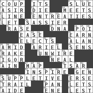 ACROSS 1. Overturn; upset 5. ___ a Wonderful Life 8. Change direction abruptly 12. SW Saudi Arabia district 13. Pass on 14. Confronts 15. Actor's bit 16. Pleas 19. Allow 20. More impudent 21. Raze (variant) 23. Heredity factor (abbr.) 24. Luau course 27. Comfort 30. Merit 31. Opts 34. ____ Jay Lerner 35. Among 38. Satellite of Uranus 40. Elected reps. 41. Libertine 42. Undo the wiring of 44. Russian composer Stravinsky 45. Anneal 46. The 18th letter of the Arabic alphabet 47. Atlas unit 50. Russian ruler of old 53. Heighten or intensify 57. Commissioned mil. rank 59. Supplying deficiencies 63. Celtic language 64. Hang back 65. Baking dish 66. Allows 67. Assistant 68. Compass dir. 69. For fear that DOWN 1. Give a ring to 2. Flexible twig of a willow tree 3. National forest in Provo, Utah 4. Before (prefix) 5. The main thing one is thinking about 6. Metal containers 7. Puts into a specified state 8. Arrange properly for use 9. Luau accessory 10. Shoshoni 11. Double-curved letter 14. Hindu Mythology: god of death 17. To free from 18. Car or cant ending 20. Lick closed 22. Sowing specialist 24. Light colored 25. NW Algerian seaport 26. Restaurants 28. Ocean 29. Shade of tan 30. Artist's stands 32. Shallow baking pan 33. Stitched 35. Roberta Peters solo 36. Wise men 37. Image 39. Untruth 43. Pace 47. Place where flour is made 48. A saturated hydrocarbon 49. Pacific Standard Time (abbr.) 51. Match 52. Musical pauses 54. Corncob 55. _ the terrible 56. French philosopher Descartes 58. A home for chicks 59. R.R. building 60. RI univ. 61. Writing tablet 62. Sliced dessert 63. Pipe bend