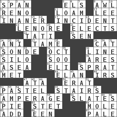 ACROSS 1. Connect, as a bridge 5. Raised railways 8. Leather borer 11. Western Nevada city 12. Rich soil 13. Area sheltered from the wind 14. More empty; more void 17. Happening 19. Poe poem 21. Chooses 22. Jacques of French films 23. Elected rep. 24. Cuckoo 27. Docile 29. Domesticated feline 32. Something which is sent 34. Sep. follower 36. Actor's bit 37. Grain storage tower 38. "Barney Miller" actor Jack 39. Ancient Greek god of war 40. At sea 41. Connecticut Ivy Leaguer 42. Small fatty European fish 43. Was introduced to 44. Style 46. Big collection agency 47. "One Day ___ Time" 50. Part of Q.E.F. 52. Soft color 55. Flight of steps 57. Electrical Measurement 59. Chalkboards 62. Sliced dessert 63. Proofreading order 64. Undercover agent 65. Find the sum of 66. Car or cant ending 67. Diluted with white DOWN 1. _ Lanka 2. Animal enclosure 3. Of or related to the anus 4. Music written for nine 5. Period of immesurable duration 6. Shoestrings 7. Grin 8. Actor Baldwin 9. Gone 10. Allows 12. Whopper 15. Maternal 16. Roll call or roster of names 18. Lair 20. Full of chinks, cracks, or crevices 24. Indian state 25. Annoying sound 26. An arm off of a larger body of water 28. Learning spot: Fr. 29. High-altitude cloud 30. Approach 31. Trials 33. ___ good deed 35. Bathroom 36. Pet locale 42. Slow-paced one 45. Caspian sea tributary 47. Had dinner 48. Laconic 49. Having winglike extensions 51. _____ steamer (cargo ship) 52. Dad 53. Among 54. Drove too fast 55. Arrange properly for use 56. Portico 58. Commissioned military rank (abbr.) 60. Pipe bend 61. Perceive with the eye