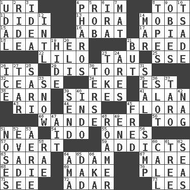 ACROSS 1. RI univ. 4. Demure 8. Small child 11. "You Light Up My Life" star Conn 13. Israeli folk dance 14. Crowds into 15. Arabian gulf 16. Blind as ____ 17. Capital of Western Samoa 18. Cordwainer's material 21. A special lineage 22. _ and Stitch 23. The 19th letter of the Greek alphabet 25. Compass dir. 26. ___ a Wonderful Life 29. What propaganda does 32. Desist 34. Make supply last 35. Eastern Standard Time (abbr.) 38. Merit 39. Begets 41. Actor Alda or Thicke 43. River (Sp.) 44. Followers of ems 45. Plants 46. Roamer 50. Coat; cloak 51. Teachers' org. 54. Wedding promise 55. Washington bills 57. Unconcealed 59. Inveterate users 63. "Two Mules for Sister ____" 64. First man 67. Female horse 68. Singer Brickell 69. Cause to be 70. Entreaty 71. Observe 72. The sixth month of the Jewish calendar 73. French article DOWN 1. Allodial 2. Travel on or in a vehicle 3. The main thing one is thinking about 4. N Egypt peninsula 5. Director Reiner 6. Lyricist Gershwin 7. Floor covering 8. Drinks excessively 9. Off-Broadway awards 10. Sadhe (variant) 12. International (abbr.) 14. Spoil 19. Flintstone garb 20. Biblical high priest 21. With the exception that 23. Casino tip 24. Ancient Greek god of war 26. Frozen water 27. Rend 28. Indian skirt 30. Laconic 31. Lick closed 33. Overwhelm 36. Groove 37. Edible starchy tuberous root 39. Post 40. _ china 42. Tired old horse 45. Flintstone 47. Small island 48. Nomad 49. Conclusion 51. Olfactory organs 52. Elude 53. Nest on high 56. Simple or foolish person 58. Actress Charlotte 60. Give a ring to 61. Family _ (genealogy) 62. Oceans 64. Housemaid (var.) 65. June honoree 66. Alias (abbr.)