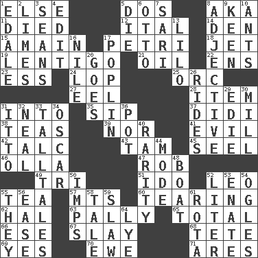 ACROSS 1. Otherwise 5. Two (Sp.) 8. Alias (abbr.) 11. Passed on 12. Slanted text style (abbr.) 14. Lair 15. At full speed 17. _ dish (used to culture cells) 18. _ stream 19. Small, flat, pigmented spot on the skin 21. Lubricate 22. Followers of ems 23. Double-curved letter 24. Chop off 25. The grampus (Milton) 27. Snakelike fish 28. Detail 31. To the inside or interior of 35. Small drink 37. "You Light Up My Life" star Conn 38. Afternoon social gatherings 39. And not 41. Tending to cause great harm 42. Baby powder 43. Scottish cap 45. Stitch closed the eyes of (a falcon) 46. Spanish pot 47. Director Reiner 49. Three (prefix) 51. Wedding promise 52. Lion 55. Afternoon social gathering 57. Mountains (abbr.) 60. Pulling into pieces 62. Actor Linden 63. Friendly 65. "_____ Recall" 66. Compass dir. 67. Kill 68. Wig 69. It is so 70. She-sheep 71. Ancient Greek god of war DOWN 1. Peak District village in England 2. Citrus fruits 3. Seines 4. Prepare for publication 5. Expire 6. "Beetle Bailey" pooch 7. Indian skirt 8. Descriptive word 9. Peachy ____! 10. Pismires 13. _ and Stitch 16. Mediterranean tributary 17. Cotton for raincoats, e.g. 20. Travels 26. Amusement-park features 29. Singer Brickell 30. Place where flour is made 31. "Tell ____ the Marines!" 32. Anneal 33. Baron Munchausen's specialties 34. Witty Wilde 36. Cooking vessel 40. Noteworthy scarcity 44. Method 48. Water vessel 50. Naughty children 52. 61 cubic inches 53. Maternal 54. Stares at amorously 55. Those things 56. Relaxation 58. Lie 59. Cole _ (cabbage dish) 61. Roll call or roster of names 64. Sodium hydroxide