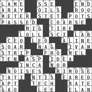 ACROSS 1. Unable to walk 5. Compass dir. 8. Conclusion 11. Like ___ of sunshine 12. Lubricates 14. Friend of Pooh 15. Distance measurement 17. Proofreading order 18. Cooking vessels 19. Went by 21. Unrefined 23. Russian fighter aircraft 25. Hoop that covers a wheel 26. Hang loosely or laxly 27. _-fi 28. Experiment locale 31. Corporate head (abbr.) 33. Lion 35. Place in a line 37. Fly high 38. Tired old horse 40. _ the terrible 41. Remove all contents or possession from 43. Away 45. Cartoonist voice _ Blanc 46. "___ Little Indians" 47. Cleo's killer 50. The main thing one is thinking about 52. South American Indian 53. And not 54. Annoying sounds 56. Full of chinks, cracks, or crevices 61. Jacques of French films 62. Nuclear Threat Initiatives 65. Having ears or earlike features 66. Fitting 67. Technology 68. Assign a rank or rating to 69. E Mali city 70. Area sheltered from the wind 71. Enthusiasm DOWN 1. Desk light 2. Type of rug 3. Floor protectors 4. Snake ____ (dice throw) 5. Distress signal 6. Be seated 7. Chooses 8. Greek god of love 9. Make mention of 10. Two (Sp.) 13. Unemotional 16. San ____ (Riviera town) 18. Before (prefix) 20. Deli pickle 22. Roberta Peters solo 24. Small, secluded valley 26. Australian parrot (variant) 28. Not recorded 29. Of or related to the anus 30. Benjamin's nick name 31. ____ d'Azur (French Riviera) 32. Merit 34. Clumsy lout 36. Pale green bean 37. Fast jet (abbr.) 39. Amused look 42. Zero-star reviews 44. Aroma 48. Aroma 49. Soft color 51. 4th largest of the Great Lakes 52. One more than two 54. California wine valley 55. Von Bismarck 57. Female horse 58. Relating to the mouth 59. Bristle 60. Genesis locale 61. Label 63. Frozen water 64. A female animal or person