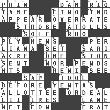 ACROSS 1. Demure 5. One of the 12 tribes of Israel 8. River (Sp.) 11. Docile 12. A pale, very dry sherry 13. Working for oneself (abbr.) 14. Seem 17. Make much ado about nothing 19. Disco prop 21. Ringlike coral islands and reefs 22. Not divided or shared with others 23. 17th letter of the Greek alphabet 24. Travel a route regularly 27. Not women's 29. For each 32. Woody, climbing, usually tropical plant 34. Arrange properly for use 36. Indian skirt 37. 43,560 square feet 38. Single 39. The Jewish people; Israel 40. Posted 41. And not 42. Hangs 43. Mountains (abbr.) 44. Painter Guido (1575-1642) 46. Perceive with the eye 47. Plant excrement 50. Instrument 52. Prior to 55. Gossips 57. One to whom something is allotted 59. Severe or trying experience 62. Cards in a Roman deck? 63. Angers 64. Unable to walk 65. Was introduced to 66. Age 67. Part of Q.E.F. DOWN 1. Parent Teacher Assoc. 2. Hit sharply and swiftly 3. Naughty children 4. Confronts 5. HTML Container Element 6. Approach 7. 0 degrees 8. Monetary unit of Yemen 9. International (abbr.) 10. Lyric poems 12. Enemy 15. Scent 16. Hero or heavy, e.g. 18. Friend of Pooh 20. Gillaume's butler role 24. Suffix with ecto or cyto 25. It is permitted: Lat. 26. Entertaining tales 28. Sir (Sp.) 29. Aches 30. Wear away 31. Wash lightly 33. Fish or hair follower 35. Cigar-shaped 36. Compass dir. 42. Peter (Polish) 45. Words to Nanette 47. "Barney Miller" actor Jack 48. Nick name for Arthur 49. Stone: prefix 51. Dipping utensil 52. Lip ointment 53. Writer Wiesel 54. Sudden quick movement 55. Consenting reply 56. Shrivel 58. Car or cant ending 60. Housemaid (var.) 61. Allow