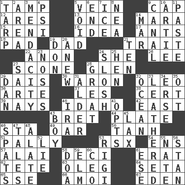 ACROSS 1. Pack (down) 5. Distinctive style or manner 9. Head covering 12. Ancient Greek god of war 13. Single time 14. Hindu Mythology: god of death 15. Painter Guido (1575-1642) 16. It may be bright or harebrained 17. Pismires 18. Groovy apt. 19. Male parent 21. Distinguishing feature 22. At once, immediately (arch.) 24. A female animal or person 26. Area sheltered from the wind 27. Biscuitlike quick bread 28. Small, secluded valley 29. Raised platform 30. Make _____ (do battle with) 32. Butter sub 36. Johnson of "Laugh-In" 37. French article 38. Certainty 39. Negative votes 40. Potato state 42. Compass direction 43. Cy Young winner Saberhagen 44. Food holder 46. R.R. building 49. Boat paddle 50. Hyperbolic tangent 51. Chummy 53. Acura sports coupe 54. Followers of ems 57. Jai ____ 58. Tenth: prefix 61. Part of Q.E.F. 62. False hair 63. Cassini of fashion 64. Stalk of a moss capsule 65. Compass dir. 66. Mine, in Marseilles 67. Genesis locale DOWN 1. Canvas cover 2. Length times width 3. Ananias' fault 4. Air pressure measure (abbr.) 5. Lacking any legal or binding force 6. Conclusion 7. Frozen water 8. Teachers' org. 9. Lessep's creation 10. Nick name for Arthur 11. Thick mixture 14. Make imperfect 19. Spanish title 20. Afresh 21. "___ Little Indians" 23. Olfactory organs 24. Agitate, as a liquid 25. Layer 27. "Two Mules for Sister ____" 28. Relatively large 29. One of the 12 tribes of Israel 31. Tree or shrub in the Birch family 32. Sea 33. Tough but pliablecoriaceous 34. Celtic language 35. Baseball player Mel 40. Lyricist Gershwin 41. Chooses 43. Male child 45. Not strict 46. Arguments over trivial matters 47. Lies 48. Having winglike extensions 52. Whopper 53. Swiss mountan, "Queen of the Mountains" 55. Nathan's nickname 56. Comedian Laurel of Laurel & Hardy 58. ___ good deed 59. Shade tree 60. Corporate head (abbr.) 61. Compass dir.