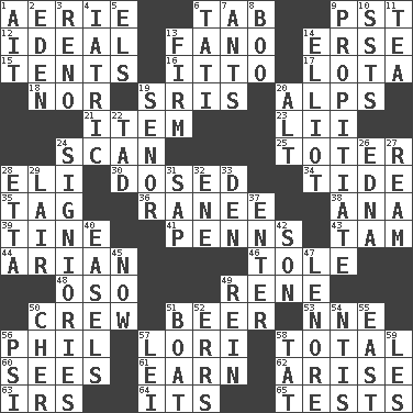 ACROSS 1. Nest on high 6. Bar bill 9. Pacific Standard Time (abbr.) 12. Standard of perfection 13. Papal veil 14. Celtic language 15. Portable shelters 16. "Tell ____ the Marines!" 17. Globular water bottle used in Asia 18. And not 19. Indian titles of respect 20. High mountains 21. A whole individual unit 23. Cards in a Roman deck? 24. Examine minutely or intensely 25. Carrier 28. Connecticut Ivy Leaguer 30. Administered medicine 34. Event that recurs at intervals 35. Label 36. The wife of a rajah (variant) 38. Santa ___, CA 39. Prong on a fork 41. Actor Sean's family 43. Scottish cap 44. Believer in; advocate of (suffix) 46. Lacquered or enameled metalware 48. Bear (Spanish) 49. French philosopher Descartes 50. Group working together 51. Fermented drink made from hops 53. Compass dir. 56. Silvers or Donahue 57. Australian parrot (variant) 58. Add up to 60. Perceives with the eye 61. Merit 62. Get up 63. Big collection agency 64. ___ a Wonderful Life 65. Trials DOWN 1. Small island 2. Paradise 3. Western Nevada city 4. Of or pertaining to medicine 5. Raised railways 6. Jacques of French films 7. Pismires 8. Sometimes accompanies a hiss 9. Conciliate 10. Fast planes 11. Beverage made from leaves 13. Become taut 14. American author Paul (1891-1958) 19. Sir (Sp.) 20. Keyboard modifier key 22. Small boy 24. Seigniories (variant) 26. Pulitzer Prize-winning author Ferber 27. 480, 500 or 516 sheets of paper 28. Singer James 29. Den 31. Plant excrement 32. Compass dir. 33. Lair 37. Keyboard key 40. Artist's stands 42. Male offspring 45. Immediately 47. Poe poem 49. It's straight from the horse's mouth 50. "Mermaids" star 51. Water vessel 52. Blunders 54. Nuclear Threat Initiatives 55. Compass direction 56. 23rd letter of the Greek alphabet 57. Luau accessory 58. Make lace 59. French article