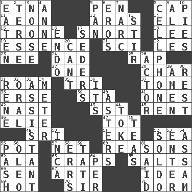 ACROSS 1. Inactive volcano in Sicily 5. Fenced enclosure 8. Head covering 11. Period of immesurable duration 12. Ancient river in northeast Turkey 14. Connecticut Ivy Leaguer 15. Heavy duty weighing machine 17. Derisive sound 18. Area sheltered from the wind 19. Substance 21. _-fi 22. French article 23. Born 24. June honoree 25. Hit sharply and swiftly 27. Single 28. Burn to charcoal 31. Wander 35. Three (prefix) 37. Heavy book 38. Celtic language 39. R.R. building 41. Singles 42. Political cartoonist Thomas 43. Fast jet (abbr.) 45. Monthly bill 46. Writer Wiesel 47. Small child 49. Indian title of respect (Mr.) 51. Make supply last 52. Ocean 55. Cooking vessel 57. Fish or hair follower 60. Thinks logically 62. Chicken ___ king 63. Dice game 65. Table seasonings 66. Elected rep. 67. Johnson of "Laugh-In" 68. It may be bright or harebrained 69. Being at a high temperature 70. Title for a knight 71. Dormintory (informal) DOWN 1. Consumed 2. Laconic 3. Trap for birds or small mammals 4. Singer Murray 5. Baking dish 6. Greek god of love 7. Drug cop 8. Portable communications device 9. Toward shelter 10. Sliced desserts 13. Use a spoon 16. Inside; within (prefix) 17. Spring feasts 20. Patter 26. Thespian 29. So be it 30. Respite 31. French philosopher Descartes 32. Relating to the mouth 33. Aide 34. Distance measurement 36. It is 40. Michaelmas daisies 44. Casino tip 48. Beverages made from leaves 50. South American Indian 52. Twentieth part of a lira 53. Keyboard key 54. Indian state 55. Romantic infatuation 56. Butter sub 58. Blunders 59. Jacques of French films 61. Stated 64. For each