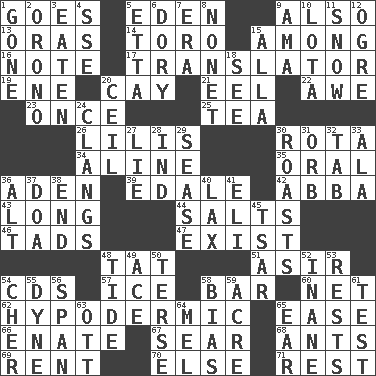 ACROSS 1. Leaves 5. Paradise 9. In addition 13. Mouths or openings 14. "Corrida" creature 15. Amid 16. Brief written record 17. Interpreter 19. Compass dir. 20. Island 21. Snakelike fish 22. Deep reverence 23. Single time 25. Beverage made from leaves 26. Ms. Damita and namesakes 30. Round or rotation of duties 34. Place in a line 35. Of the mouth 36. Arabian gulf 39. Peak District village in England 42. Swedish rock group 43. Having great length 44. Table seasonings 46. Bits 47. Have an existence 48. Make lace 51. SW Saudi Arabia district 54. Music discs 57. Frozen water 58. Long, evenly shaped piece 60. Fish or hair follower 62. Under the skin 65. Relaxation 66. Related on the mother's side 67. Burn superficially 68. Pismires 69. Monthly bill 70. Otherwise 71. State of inaction DOWN 1. Went 2. U. of Maine site 3. Consumed 4. Compass dir. 5. Singer James 6. Small, narrow, flatbottom fishing boat 7. Period 8. Music written for nine 9. Nursemaid (var.) 10. Globular water bottle used in Asia 11. Overwhelm 12. Legendary monster 15. Silent film actress Nazimova 18. Observe 20. To provide with a ceiling 24. Rings like a ship's bell 27. Untruth 28. Working for oneself (abbr.) 29. Gospel singer Marvin 30. Cooks with dry heat, as in an oven 31. Globe 32. Bar bill 33. According to 36. Keyboard modifier key 37. ___ good deed 38. Conclude 40. Not strict 41. Biblical high priest 45. Russian ruler of old 48. Event that recurs at intervals 49. Adept person 50. Laconic 52. Empty; void 53. Musical pauses 54. "Mermaids" star 55. Centimeter-gram-second unit of force 56. Connect, as a bridge 58. Prejudice 59. Land measure 61. Trial 63. Baseball player Mel 64. Cartoonist voice _ Blanc 65. Ewer handle