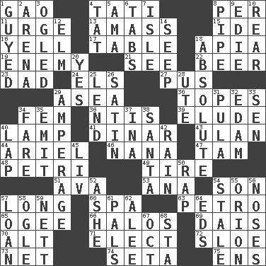 ACROSS 1. E Mali city 4. Jacques of French films 8. For each 11. Goad 13. Collect or gather 15. Binary compound 16. Shout 17. Eating place 18. Capital of Western Samoa 19. Foe 21. Observe 22. Fermented drink made from hops 23. June honoree 24. Raised railways 27. Ichor 29. Toward the sea 30. Drinks excessively 34. Opposite of masc. 36. Nuclear Threat Initiatives 39. Evade 40. Desk light 41. Middle Eastern gold or silver currency 43. ____ Bator, Mongolia 44. Satellite of Uranus 46. Nanny 47. Scottish cap 48. _ dish (used to culture cells) 49. Become fatigued 51. Actress Gardner 53. Santa ___, CA 54. Male offspring 57. Yearn 60. Health resort 63. Stone: prefix 65. Double curve, resembling the letter S 66. Saint headwear 69. Raised platform 70. Keyboard modifier key 71. Opt 72. _ gin 73. Fish or hair follower 74. Bristle 75. Followers of ems DOWN 1. Mocked 2. Sports stadium 3. Stared 4. Make lace 5. Wet nurse (var.) 6. Bar bills 7. Capri or Wright 8. Corncob 9. Singer Brickell 10. Buttocks 12. Shade tree 14. Ooze 18. Utter; complete 20. Affirmative reply 25. Grant temporary use of 26. Smooth fabric 28. Shoshoni 29. Electrical Measurement 31. Monetary unit of Botswana 32. Dutch treat 33. Elected rep. 34. Conductor's collection 35. Send forth 37. _ tizzy (2 wds.) 38. Before Barbara or Clara 40. Pet locale 42. Water falling in drops from the sky 45. 54 in ancient Rome 50. Reproach for some lapse or misdeed 52. American tennis player Robert 54. Lacking originality or spontaneity 55. Constellation of myth 56. Olfactory organs 57. Grant temporary use of 58. Stare 59. Remaining after all deductions 61. Friends 62. Toward shelter 64. Begley and Asner 67. Sep. follower 68. R.R. building