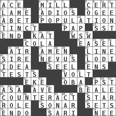 ACROSS 1. Adept person 4. Place where flour is made 8. An absolute certainty 12. Unable to walk 14. Goodbye (Sp.) 16. Double curve, resembling the letter S 17. Collude with 18. Census information 20. Tinged 22. Infant food 23. Fast jet (abbr.) 24. Conclude 25. Krazy ___ of comics 28. Compass dir. 30. Root beer relative 31. Artist's stand 35. Wind 37. So be it 40. Actor's bit 41. Beget 42. Mole, birthmark 44. Farming town in central California 45. It may be bright or harebrained 46. Stitch closed the eyes of (a falcon) 47. Followers of ems 48. Trials 50. Electrical Unit 52. Make supply last 54. Chief or king in Benin or Nigeria 55. Pacific Standard Time (abbr.) 58. White ___ sheet 61. "___ Maria" 63. Calif. Air Force Base 65. Act in opposition 70. Play the lead 71. Hero or heavy, e.g. 72. Echolocation 73. Puts into a specified state 74. Inside; within (prefix) 75. Indian skirt 76. Born DOWN 1. Having winglike extensions 2. Apartment or room in a ship 3. Make improvements or corrections to 4. Atlas unit 5. Wedding promise 6. Mouth edge 7. Central Nebraska county 8. Small bed 9. Armor plate that protects the chest 10. Vintage cars 11. Portable shelter 13. And so on (abbr.) 15. Cole _ (cabbage dish) 19. Domed church section 21. Ring climax 26. Actor Alda or Thicke 27. Makes less strong or intense 29. Place for singles 30. Cause to be 32. The Jewish people; Israel 33. Extremities 34. Flowery wreath 35. Helper 36. Angers 38. First lady 39. New (sp.) 41. Be seated 43. Oscar Madison type 49. Three-handed card game 51. Experiment locale 53. Nights before holidays 55. Eucharist need 56. Schedule 57. Laconic 58. 1/640 square mile 59. Within a short period 60. Old (Scot.) 62. Greek god of love 64. Double-curved letter 66. Modern: prefix 67. Santa ___, CA 68. 4-wheeled motor vehicle 69. Three (prefix)