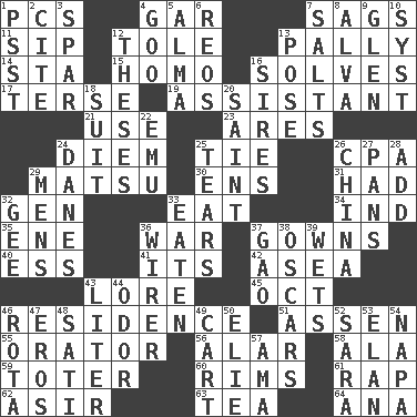 ACROSS 1. Personal Computers (abbr.) 4. Slender fish 7. Settles 11. Small drink 12. Lacquered or enameled metalware 13. Friendly 14. R.R. building 15. Same (prefix) 16. Finds the solution 17. Laconic 19. Aide 21. Purpose 23. Ancient Greek god of war 24. South Vietnam president (1954) 25. Standoff 26. Accounting whiz (abbr.) 29. Taiwanese island in East China Sea 30. Followers of ems 31. Possessed 32. Commissioned mil. rank 33. Erode 34. Indiana (abbr.) 35. Compass dir. 36. Armed conflict 37. Women's formal wear 40. Double-curved letter 41. It is 42. At sea 43. Old wives' tales, e.g. 45. Sep. follower 46. Dwelling 51. NE Netherlands city 55. Speaker 56. Having or resembling wings 58. Wing 59. Carrier 60. Basketball hoops 61. Hit sharply and swiftly 62. SW Saudi Arabia district 63. Afternoon social gathering 64. Santa ___, CA DOWN 1. Inconspicuous attention getter 2. Quote 3. Coast Guard woman 4. Thick or sticky substance 5. _ mater 6. Vintage cars 7. Table seasonings 8. Inventor's middle name 9. Small, secluded valley 10. System (abbr.) 12. College papers 13. Introduce or present, as a question 16. Founders of families 18. Costume for a special activity 20. Inhabitant of Heaven 22. Australian flightless bird 24. Natives or inhabitants of Denmark 25. Lacerates 26. Large country 27. Baking dishes 28. Find the sum of 29. Not women's 32. Turn to the right 33. Consumed 36. One who wires 37. E Mali city 38. Motion picture awards 39. Moistens 43. 61 cubic inches 44. Scent 46. Roll call or roster of names 47. Greek god of love 48. Suttee (variant) 49. Draw slowly or heavily 50. Writer Wiesel 52. "Two Mules for Sister ____" 53. Enthusiasm 54. California wine valley 57. Nursemaid (var.)