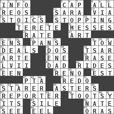 ACROSS 1. Information 5. Head covering 8. 100% 11. Vintage cars 12. "Two Mules for Sister ____" 13. By way of 14. Unemotional ones 17. Closing up, plugging up 19. Cylindrical with tapered ends 21. Makes clutter 22. Pace 23. Tate display 24. Followers of ems 27. Baking dishes 29. Pull behind 32. Allots cards 34. Two (Sp.) 36. Russian ruler of old 37. Johnson of "Laugh-In" 38. Compass dir. 39. To erase 40. 57 in ancient Rome 41. June honoree 42. Amusement-park features 43. Car or cant ending 44. Former U.S. Attorney General Janet 46. Eastern Standard Time (abbr.) 47. Parent Teacher Assoc. 50. Redecorate 52. A viewer who gazes fixedly 55. Michaelmas daisies 57. News announcer 59. Tootsie (variant) 62. ___ a Wonderful Life 63. Filth; sediment 64. Nathan's nickname 65. Observe 66. Snakelike fish 67. Mouths or openings DOWN 1. Big collection agency 2. Fish or hair follower 3. Lowest support of a structure 4. Flexible twig of a willow tree 5. Domesticated feline 6. Scent 7. Some stationery 8. Deliberation 9. Actor's bit 10. Falls behind 12. Compass dir. 15. Dice game 16. Bristle 18. Pacific Standard Time (abbr.) 20. Looked after 24. Peak District village in England 25. Boldness 26. Smooth fabric 28. Echolocation 29. Sadhe (variant) 30. Fertile tracts in a desert 31. Obtain by seizing forcibly or violently 33. Luau accessory 35. Spring feasts 36. Three (prefix) 42. Cowboy competition 45. Remaining after all deductions 47. Adept person 48. Laconic 49. Nick name for Arthur 51. U. of Maine site 52. Indian titles of respect 53. Wig 54. Domed church section 55. "We ___ not amused" (Victoria) 56. Play the lead 58. Pipe bend 60. R.R. building 61. It is so