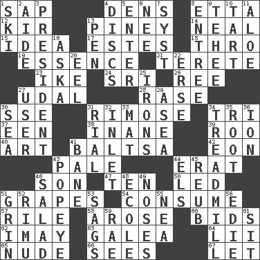 ACROSS 1. Plant excrement 4. Lairs 8. Singer James 12. Apertif with cassis 13. Abounding in pines 14. Anneal 15. The content of cognition 17. _____ Park, CO 18. Through, poetically 19. Gist 21. Cigar-shaped 23. Mamie's mate 24. _ Lanka 26. To riddle 27. Freehold land 28. To erase 30. Compass dir. 31. Full of chinks, cracks, or crevices 34. Three (prefix) 37. Car or cant ending 38. Empty; void 39. Friend of Pooh 40. Tate display 41. Greek mezzo-soprano Agnes 42. A really long time 43. Diluted with white 44. Part of Q.E.F. 46. Boy, to dad 47. Nine, plus one 50. Directed 51. Wine fruits 54. Ingest 57. Cause heat under the collar 58. Came up 60. Auction offers 62. "If ____ say so..." 63. An organ shaped like a helmet 64. Cards in a Roman deck? 65. Unadorned 66. Perceives with the eye 67. Allow DOWN 1. What Jean-Claude Killy likes to do 2. Helper 3. Elected leader of a country 4. Plates 5. Keyboard key 6. Born 7. System (abbr.) 8. Main course 9. Giggle 10. Small pie 11. _ vera 13. Fenced enclosure 16. "____ silly question..." 20. Snakelike fish 22. Celtic language 25. Metal shackles 27. One who uses or employs something 29. Toward the sea 30. Ocean 31. Monetary unit of Yemen 32. An arm off of a larger body of water 33. Floor protector 34. Excercise machine 35. Carrot, for example 36. Electrically charged atom 41. Object of repulsion 43. Wimpy's pal 44. Raised railways 45. Reuben's nickname 46. First course 48. Learning spot: Fr. 49. Olfactory organs 51. Smile widely 52. Tall New Zealand timber tree 53. Settles 55. Teachers' org. 56. Singer Brickell 59. Actress Charlotte 61. Be seated
