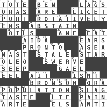 ACROSS 1. Haul 5. Benjamin's nick name 8. Straggles 12. Mouths or openings 13. "We ___ not amused" (Victoria) 14. It is permitted: Lat. 15. Sweet dark-red dessert wine 16. Happening in regular succession 19. Followers of ems 20. Choose not to consume 21. Petroleums 23. One (Scot) 24. Ingest 27. Opera by Verdi 30. Hearing organs 31. Right away 34. Toward the sea 35. Political cartoonist Thomas 38. Lacking originality or spontaneity 40. Play the lead 41. Butter sub 42. Turn aside suddenly 44. Ooze 45. Highlander 46. Snakelike fish 47. Small island 50. Is not 53. "Death Wish" actor 57. Mouth or opening 59. Census information 63. Volcanic refuse 64. Clothes sense 65. Whopper 66. Ache 67. Johnson of "Laugh-In" 68. Raised railways 69. Opposed to DOWN 1. Drink excessively 2. U. of Maine site 3. Tarsus (plural) 4. Eastern Standard Time (abbr.) 5. Sharp remark 6. Greek god of love 7. Remaining after all deductions 8. 54 in ancient Rome 9. Adept person 10. Set 11. Filthy place 14. Actor's bit 17. Auto club (abbr.) 18. Metal container 20. SW Saudi Arabia district 22. Portable computer 24. Compass direction 25. Length times width 26. Russian ruler of old 28. Two (Sp.) 29. Pismires 30. Artist's stands 32. The 23rd letter of the Hebrew alphabet 33. Cassini of fashion 35. Sense of smell 36. Toward shelter 37. Sew up the eyelids of hawks and falcons 39. Period 43. Distinctive style or manner 47. Competent 48. Retirement account (abbr.) 49. Small child 51. Pitcher Ryan 52. Distinguishing feature 54. "Death on the ____" 55. Land 56. Singles 58. Hindu god of fire 59. Parent Teacher Association (abbr.) 60. Boat paddle 61. Pacific Standard Time (abbr.) 62. Shoshoni 63. Health resort