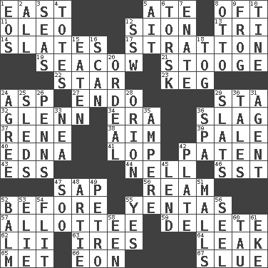 ACROSS 1. Compass direction 5. Had dinner 8. Often (poetically) 11. Margarine 12. The Jewish people; Israel 13. Three (prefix) 14. Chalkboards 17. Ski resort town in Vermont 19. Manatee 21. Moe Howard, for one 22. Play the lead 23. Barrel 24. Cleo's killer 27. Inside; within (prefix) 29. R.R. building 32. American astronaut and politician John 34. Period 36. Volcanic refuse 37. French philosopher Descartes 38. Direct toward a target or goal 39. Light colored 40. Pulitzer Prize-winning author Ferber 41. Chop off 42. Eucharist need 43. Curvy letter 44. 1994 drama film starring Jodie Foster 46. Fast jet (abbr.) 47. Plant excrement 50. 480, 500 or 516 sheets of paper 52. Prior to 55. Gossips 57. One to whom something is allotted 59. Keyboard key 62. Cards in a Roman deck? 63. Angers 64. Path through which fluid escapes 65. Was introduced to 66. Period of immesurable duration 67. Turn sharply DOWN 1. Greek goddess of the dawn 2. Everything 3. Oceans 4. Lugs 5. Small island 6. Cod relative 7. Maternal 8. Von Bismarck 9. Tree-dwelling hopper 10. Prong on a fork 12. Compass dir. 15. Eroded 16. Examine hastily 18. Coat; cloak 20. Severe or trying experience 24. Match 25. Bobsleighs 26. Actor Sean's family 28. Constellation of myth 29. Narrow boards 30. Lies 31. Rep 33. Teachers' org. 35. Electrical Unit 36. Health resort 42. Food holder 45. Grant temporary use of 47. "Barney Miller" actor Jack 48. Nick name for Arthur 49. Stone: prefix 51. Shopping centers 52. Lip ointment 53. Writer Wiesel 54. Secret move to avoid paying debts 55. Affirmative reply 56. Stitch closed the eyes of (a falcon) 58. Car or cant ending 60. The 19th letter of the Greek alphabet 61. Make supply last