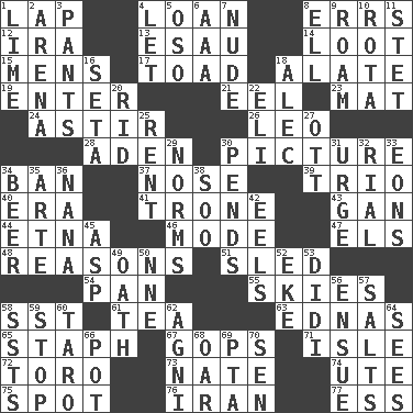 ACROSS 1. Pet locale 4. Grant temporary use of 8. Blunders 12. Retirement account (abbr.) 13. Son of Isaac 14. Plunder 15. Not women's 17. Frog relative 18. Having winglike extensions 19. Keyboard key 21. Snakelike fish 23. Floor protector 24. Being in motion 26. Lion 28. An important port of Yemen 30. Photo 34. Prohibit 37. Olfactory organ 39. Musical group of three 40. Period 41. Heavy duty weighing machine 43. Separate the seeds from cotton 44. Inactive volcano in Sicily 46. Method 47. Raised railways 48. Thinks logically 51. Downhill vehicle 54. Baking dish 55. Atmospheres 58. Fast jet (abbr.) 61. Afternoon social gathering 63. Ferber et al. 65. Staphylococcus 67. Republicans 71. Small island 72. "Corrida" creature 73. Nathan's nickname 74. Shoshoni 75. Blemish 76. SW Asia republic 77. Double-curved letter DOWN 1. Welles in "The Third Man" 2. Sports stadium 3. Leg coverings 4. Allow 5. Bear (Spanish) 6. Auto club (abbr.) 7. Unadorned 8. Pipe bend 9. Wander 10. Roll call or roster of names 11. Proofreading order 16. Stalk of a moss capsule 18. Actor Baldwin 20. To free from 22. Biblical high priest 25. Monthly bill 27. Baseball player Mel 29. Typical models 30. Hangs 31. Goad 32. Monetary unit of Yemen 33. Immeasurably long periods of time 34. Fermented drink made from hops 35. Johnson of "Laugh-In" 36. Grandmother 38. "Barney Miller" actor Jack 42. Snakelike fish 45. Viper 49. Pledge 50. Compass dir. 52. Supplement with great effort 53. "You Light Up My Life" star Conn 56. Follow as a consequence or result 57. Table seasonings 58. Fast planes 59. Obstruct or block passage 60. Pacific island yam 62. Hindu god of fire 64. Observes 66. Cooking vessel 68. Rowing implement 69. Parent Teacher Association (abbr.) 70. Elected rep.