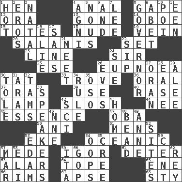 ACROSS 1. Layer 4. Of or related to the anus 8. Stare wonderingly 12. Mouth or opening 13. Went 14. Mitch Miller's instrument 15. Lugs 18. Unadorned 19. Distinctive style or manner 20. Deli grouping 22. Put into a specified state 23. Actor's bit 24. Title for a knight 25. Compass dir. 26. Normal relaxed breathing 30. Make lace 33. Collection of objects 36. Taken by mouth 37. Mouths or openings 39. Purpose 40. Raze (variant) 41. Desk light 42. Splash clumsily 44. Born 45. Core 47. Chief or king in Benin or Nigeria 50. Black tropical American cuckoo 51. Not women's 53. Supplement with great effort 54. Pertaining to the sea 57. Ancient Persian 59. Russian composer Stravinsky 61. Prevent from occurring 63. Having or resembling wings 64. Drink excessively 65. Compass dir. 66. Basketball hoops 67. Domed church section 68. Filthy place DOWN 1. Being at a high temperature 2. Greek god of love 3. Brizilian seaport 4. Hindu god of fire 5. Horse sense 6. Also 7. Area sheltered from the wind 8. Head of state? 9. Collude with 10. Luau course 11. Car or cant ending 16. Writer Wiesel 17. Without 21. Confront 22. Small drink 24. Take to court 26. Nights before holidays 27. NW Algerian seaport 28. Relaxation 29. Toward shelter 30. Lacquered or enameled metalware 31. Ancient river in northeast Turkey 32. Scottish caps 34. General guideline 35. Bear (Spanish) 38. Orators 42. _-fi 43. Residence 46. Compass dir. 48. Necklace unit 49. Singer Murray 52. Locates 53. Dutch treat 54. I made a mistake 55. Algonquian 56. Penny 57. Spoil 58. Connecticut Ivy Leaguer 59. Call ___ day 60. Grand Old Party 62. Marina Del _, California