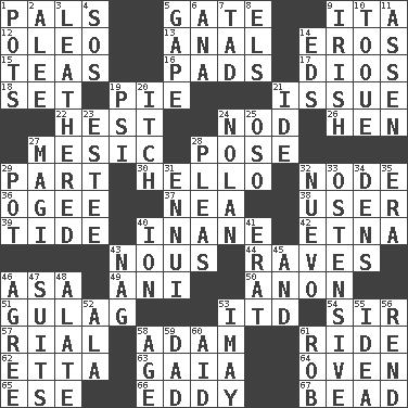 ACROSS 1. Friends 5. Yard entry 9. Call ___ day 12. Margarine 13. Of or related to the anus 14. Greek god of love 15. Beverages made from leaves 16. Groovy apts. 17. "Vaya con ____" 18. Arrange properly for use 19. Sliced dessert 21. Come out of 22. Command 24. Dreamland 26. Layer 27. Mesonic 28. Introduce or present, as a question 29. Piece 30. Phone greeting 32. Thickened enlargement 36. Double curve, resembling the letter S 37. Teachers' org. 38. One who uses or employs something 39. Event that recurs at intervals 40. Empty; void 42. Inactive volcano in Sicily 43. Common sense 44. All-night dance parties 46. White ___ sheet 49. Cuckoo 50. Soon (poet.) 51. POW camp 53. It would 54. Title for a knight 57. Monetary unit of Yemen 58. First man 61. Travel on or in a vehicle 62. Singer James 63. Greek goddess of the earth (variant) 64. Baking chamber 65. Compass dir. 66. Whirlpool 67. Necklace unit DOWN 1. Plant holders 2. Toward shelter 3. Resembling or made to resemble leather 4. Distress signal 5. Open wide 6. Santa ___, CA 7. Small boy 8. Raised railways 9. From or relating to Ireland 10. Woman's close-fitting hat 11. NE Netherlands city 14. Begley and Asner 19. 23rd letter of the Greek alphabet 20. Hankering 21. Binary compound 23. First name in cosmetics 24. Pitcher Ryan 25. Bear (Spanish) 27. Wise men 28. Entreaties 29. Cooking vessel 31. World-weariness 32. New (sp.) 33. Clearly or manifestly demonstrative 34. Habitations of wild animals 35. Epoch 40. Electrically charged atom 41. Part of Q.E.F. 43. Tired old horse 45. Plus 46. Match 47. Sets of matching outer garments 48. Having winglike extensions 52. Chicken ___ king 53. "If ____ say so..." 55. It may be bright or harebrained 56. Tear apart 58. Personal question 59. June honoree 60. Help 61. Director Reiner