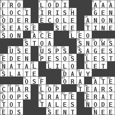 ACROSS 1. Away 4. Farming town in central California 8. American Automobile Association (abbr.) 11. Event scenes 13. From or relating to Ireland 15. Commissioned military rank (abbr.) 16. River in Europe 17. Learning spot: Fr. 18. At once, immediately (arch.) 19. Gospel singer Marvin 21. Perceive with the eye 22. Prong on a fork 23. Male child 24. Adept person 27. Lion 29. Portico 30. Frozen precipitation (plural) 34. Purpose 36. United States Postal Service (abbr.) 39. Gurus 40. Genesis locale 41. Mexican monetary units 43. For fear that 44. Brizilian seaport 46. _ and Stitch 47. Allow 48. Schedule 49. _ Jones' Locker 51. Order of Saint Francis (abbr.) 53. Mouth or opening 54. Had dinner 57. Burn to charcoal 60. Chop off 63. Lacerates 65. I made a mistake 66. Feeling or showing extreme anger 69. Part of Q.E.F. 70. Small child 71. Lies 72. Connecting point 73. Begley and Asner 74. Emitted 75. Born DOWN 1. Soft thread for cleaning between teeth 2. Cowboy competition 3. Sea 4. Untruth 5. The grampus (Milton) 6. "Vaya con ____" 7. Capri or Wright 8. Hindu god of fire 9. Period of immesurable duration 10. Singer Murray 12. Big collection agency 14. The bottom of a shoe or boot 18. Without tonality 20. Erode 25. Overturn; upset 26. Artist's stand 28. Curvy letter 29. Legislators 31. Double curve, resembling the letter S 32. 270 degrees 33. Fast jet (abbr.) 34. Hereditary estate 35. Bristle 37. 23rd letter of the Greek alphabet 38. Twentieth part of a lira 40. Followers of ems 42. Fly high 45. French article 50. Large container 52. Secret move to avoid paying debts 54. Composer Copland 55. Barter 56. First name in cosmetics 57. ____ d'Azur (French Riviera) 58. Parka part 59. Flats, for short 61. Mouths or openings 62. Light colored 64. Car or cant ending 67. Nine, plus one 68. Eastern Standard Time (abbr.)