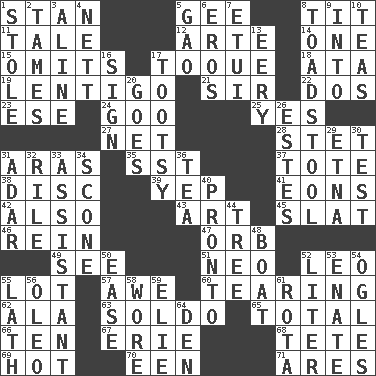 ACROSS 1. Comedian Laurel of Laurel & Hardy 5. Turn to the right 8. Teat (slang) 11. Story 12. Johnson of "Laugh-In" 14. Single 15. Leaves out 17. Woman's close-fitting hat 18. _ moment's notice (2 wds.) 19. Small, flat, pigmented spot on the skin 21. Title for a knight 22. Two (Sp.) 23. Compass dir. 24. Thick or sticky substance 25. Affirmative reply 27. Fish or hair follower 28. Proofreading order 31. Caspian sea tributary 35. Fast jet (abbr.) 37. Carry 38. Compact _ 39. Slangy assent 41. Immeasurably long periods of time 42. In addition 43. Nonscientific branch of learning 45. Narrow board 46. It's straight from the horse's mouth 47. Globe 49. Observe 51. Modern: prefix 52. Lion 55. Car dealer's back yard 57. Deep reverence 60. Lacerating 62. Insect wing 63. Twentieth part of a lira 65. "_____ Recall" 66. Nine, plus one 67. 4th largest of the Great Lakes 68. False hair 69. Being at a high temperature 70. Car or cant ending 71. Ancient Greek god of war DOWN 1. Fur scarf 2. Makes less strong or intense 3. Place in a line 4. Remaining after all deductions 5. E Mali city 6. Greek god of love 7. Needle holder 8. Inedible or poisonous agaric 9. To the inside or interior of 10. Afternoon social gatherings 13. Suggestive of the supernatural 16. Signal 17. Tootsie (variant) 20. Travels 26. _____ Park, CO 29. Inactive volcano in Sicily 30. Trial 31. The sixth month of the Jewish calendar 32. Cause heat under the collar 33. Helper 34. Biscuitlike quick bread 36. Beverage made from leaves 40. Right away 44. Relationship diagram 48. Water vessel 50. Comfort 52. 61 cubic inches 53. Related on the mother's side 54. Stares 55. Thin strip of wood or metal 56. Margarine 58. Had on 59. Writer Wiesel 61. Roll call or roster of names 64. Lair