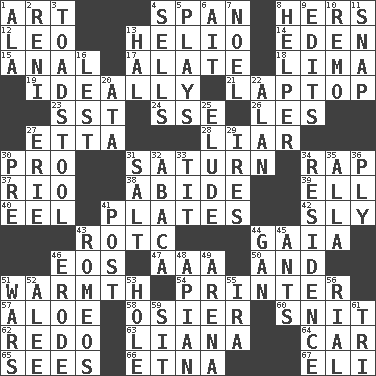 ACROSS 1. Nonscientific branch of learning 4. Connect, as a bridge 8. Possessive pronoun 12. Lion 13. Sun: prefix 14. Paradise 15. Of or related to the anus 17. Having winglike extensions 18. Pale green bean 19. Under perfect conditions 21. Portable computer 23. Fast jet (abbr.) 24. Compass dir. 26. French article 27. Singer James 28. One who doesn't tell the truth 30. Adept person 31. Titan orbits this 34. Reproach for some lapse or misdeed 37. River (Sp.) 38. Stay 39. Pipe bend 40. Snakelike fish 41. Food holders 42. Cunning 43. College mil. group 44. Greek goddess of the earth (variant) 46. Greek goddess of the dawn 47. Auto club (abbr.) 50. Plus 51. Heat 54. Hard copy producer 57. Medicinal plant 58. Flexible twig of a willow tree 60. In a ____ (agitated or irritated) 62. Redecorate 63. Climbing, woody, usually tropical vines 64. Auto 65. Perceives with the eye 66. Inactive volcano in Sicily 67. Biblical high priest DOWN 1. In the manner of 2. Painter Guido (1575-1642) 3. Inedible or poisonous agaric 4. Exchanges for money 5. Romps 6. Small island 7. Christmas carol 8. Assistant 9. Proofreads 10. San ____ (Riviera town) 11. Fastener 13. Actor Linden 16. For fear that 20. "One Day ___ Time" 22. ____ Jay Lerner 25. Dodge 27. 4th largest of the Great Lakes 29. Angers 30. Before (prefix) 31. Table seasoning 32. Phillipine bananalike plant 33. Teat (slang) 34. Dwelling 35. Silent film actress Nazimova 36. Apply oneself diligently 41. Mail 43. Lover boys 44. Separate the seeds from cotton 45. Pismires 46. Wear away 48. Bee-related 49. Sports stadium 51. Armed conflicts 52. Toward shelter 53. Hollow 55. Lyricist Gershwin 56. Monetary unit of Yemen 59. Be seated 61. Three (prefix)