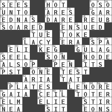ACROSS 1. Observes 5. Being at a high temperature 8. Bear (Spanish) 11. To (old English) 12. Ancient Greek god of war 14. Slender fish 15. Ferber et al. 17. Have the gumption 18. Reuben's nickname 19. Flew 21. Took place subsequently 23. Third day of the wk. 25. Casino tip 26. Made of lace 27. Epoch 28. Health resort 31. Biblical high priest 33. Cask 35. POW camp 37. Stitch closed the eyes of (a falcon) 38. Male child 40. Thickened enlargement 41. Columnist Joseph or Stewart 43. Animal enclosure 45. ___ a Wonderful Life 46. Pacific Standard Time (abbr.) 47. Single 50. Trial 52. Operatic vocal solo 53. Make lace 54. Food holders 56. Poe poem 61. Greek goddess of the earth (variant) 62. To provide with a ceiling 65. Carrier 66. Shade tree 67. Writer Wiesel 68. Use a spoon 69. Teachers' org. 70. Be seated 71. Immeasurably long periods of time DOWN 1. Takes to court 2. Inside; within (prefix) 3. Inactive volcano in Sicily 4. Fly high 5. Possessed 6. Mouth or opening 7. Cigar-shaped 8. Double curve, resembling the letter S 9. Saudi Arabian king (1953-1964) 10. Globe 13. Sir (Sp.) 16. Bristle 18. Sorrow 20. Evade 22. Heroin 24. Snake ____ (dice throw) 26. _ and Stitch 28. Position in a hierarchy or organization 29. Groovy apts. 30. Personal question 31. Snakelike fish 32. For fear that 34. Republican Party 36. A single undivided whole 37. Plant excrement 39. Remaining after all deductions 42. Left side of a ship or aircraft 44. Actress Patricia 48. Sibling's daughter 49. Artist's stands 51. Proofreading order 52. American Automobile Association (abbr.) 54. Diluted with white 55. Pale green bean 57. Sense of smell 58. Von Bismarck 59. It's straight from the horse's mouth 60. Blunders 61. Commissioned military rank (abbr.) 63. One more than two 64. Allow