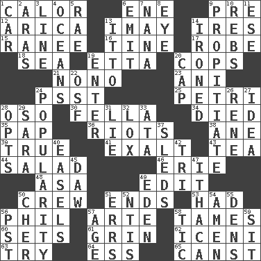 ACROSS 1. Bodily heat indicating an inflammation 6. Compass dir. 9. Before (prefix) 12. N. Chile seaport 13. "If ____ say so..." 14. Angers 15. Indian princess (variant) 16. Prong on a fork 17. Loose flowing garment 18. Ocean 19. Singer James 20. 911 reaches them 21. Words to Nanette 23. Cuckoo 24. Inconspicuous attention getter 25. _ dish (used to culture cells) 28. Bear (Spanish) 30. Chap (slang) 34. Passed on 35. Infant food 36. Debaucheries 38. One (Scot) 39. Loyal 41. Honor 43. Afternoon social gathering 44. First course 46. 4th largest of the Great Lakes 48. White ___ sheet 49. Prepare for publication 50. Ship's personnel 51. Conclusions 53. Possessed 56. Silvers or Donahue 57. Johnson of "Laugh-In" 58. Domesticates 60. Puts into a specified state 61. Broad smile 62. Ancient Celtic tribe of eastern Britain 63. Attempt to accomplish something 64. Double-curved letter 65. 2nd pers. sing. pres. of can (arch.) DOWN 1. Automobile 2. Ancient river in northeast Turkey 3. Actor's bit 4. Seas 5. Actress Charlotte 6. Send forth 7. Nanny 8. Sight organ 9. Appease 10. Confederate soldiers (slang) 11. Compass dir. 13. "Tell ____ the Marines!" 14. Pressed 19. Keyboard key 20. Head covering 22. Order of Saint Francis (abbr.) 24. Teen's desire 26. French philosopher Descartes 27. The content of cognition 28. Chooses 29. "Two Mules for Sister ____" 31. Untruth 32. Brine-cured salmon 33. "One Day ___ Time" 37. Bobsleighs 40. Artist's stands 42. Three (prefix) 45. Fool 47. New York city 49. Paradise 50. "Mermaids" star 51. Blunders 52. Nuclear Threat Initiatives 54. So be it 55. Hiding places for outlaws 56. Pacific Standard Time (abbr.) 57. Ripen 58. Nervous spasm 59. Be seated