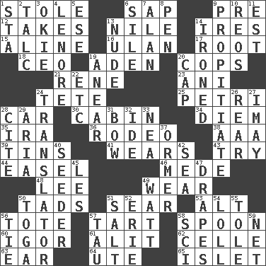 ACROSS 1. Fur scarf 6. Plant excrement 9. Before (prefix) 12. Proceeds 13. "Death on the ____" 14. Angers 15. Place in a line 16. Uhlan (variant) 17. Carrot, for example 18. Corporate head (abbr.) 19. An important port of Yemen 20. 911 reaches them 21. French philosopher Descartes 23. Black tropical American cuckoo 24. False hair 25. _ dish (used to culture cells) 28. Auto 30. Apartment or room in a ship 34. South Vietnam president (1954) 35. Retirement account (abbr.) 36. Cowboy competition 38. Auto club (abbr.) 39. Airtight sealed metal containers 41. Erodes 43. Attempt 44. Artist's stand 46. Ancient Persian 48. Area sheltered from the wind 49. Put on (as clothing) 50. Small amounts or degrees 51. Burn superficially 53. Keyboard modifier key 56. Haul 57. Small pie 58. Soup utensil 60. Russian composer Stravinsky 61. Set down 62. Cell (Danish) 63. Hearing organ 64. Shoshoni 65. Small island DOWN 1. R.R. building 2. Baby powder 3. Migrant worker of the '30s 4. Poe poem 5. Compass dir. 6. Drop; flow; fall 7. ____ Jay Lerner 8. Animal enclosure 9. Appease 10. Vintage cars 11. Eastern Standard Time (abbr.) 13. Unadorned 14. Pressed 19. Approach 20. Head covering 22. And so on (abbr.) 24. Interpreter 26. Hitchcock's "____ Window" 27. "If ____ say so..." 28. Quote 29. Operatic vocal solo 31. Arrow shooter 32. Binary compound 33. Teachers' org. 37. Abalone 40. Sowing specialist 42. Ocean 45. French article 47. Window treatments 49. Electrical Unit 50. Ancient Roman robe 51. Table seasoning 52. 4th largest of the Great Lakes 54. Hang loosely or laxly 55. Lacquered or enameled metalware 56. Neckwear 57. The 19th letter of the Greek alphabet 58. _-fi 59. Fish or hair follower