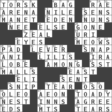 ACROSS 1. Cod relative 6. Paper or plastic container 9. Actress Charlotte 12. Sports stadium 13. "Death on the ____" 14. Elected reps. 15. French painter Edouard 16. Genesis locale 17. Religious women 18. Born 19. Otherwise 20. Went 21. Ardor 23. RI univ. 24. Sight organs 25. Catcalls? 28. Groovy apt. 30. Prying instrument 34. Fastener 35. Black tropical American cuckoo 36. Ms. Damita and namesakes 38. Lyricist Gershwin 39. Ear part 41. Amid 43. Fast jet (abbr.) 44. Promenades 46. 90 degrees 48. Connecticut Ivy Leaguer 49. Transmitted 50. Clip 51. Rend 53. Bear (Spanish) 56. Margarine 57. A really long time 58. Sycophant 60. A home for chicks 61. Taverns 62. Match 63. Begley and Asner 64. Mountains (abbr.) 65. Pulls into pieces DOWN 1. Scottish cap 2. NW Algerian seaport 3. French philosopher Descartes 4. Dwarf with a sinus problem 5. Krazy ___ of comics 6. Auction offers 7. Toward shelter 8. Commissioned mil. rank 9. One who advocates reunion 10. Singer Murray 11. Double-curved letter 13. 1994 drama film starring Jodie Foster 14. Sounds asleep 19. Artist's stand 20. Chewing product 22. Snakelike fish 24. The property of being fit to eat 26. Armed conflicts 27. Argument over a trivial matter 28. Inside of hand 29. Small Philippine buffalo 31. By way of 32. Shade tree 33. River (Sp.) 37. Scornful expression 40. American author Paul (1891-1958) 42. Separate the seeds from cotton 45. Small drink 47. Moe Howard, for one 49. Without 50. Downhill vehicle 51. Portable shelter 52. Immeasurably long periods of time 54. "Two Mules for Sister ____" 55. Baltic tributary 56. Single 57. Direct toward a target or goal 58. Make lace 59. Consenting reply