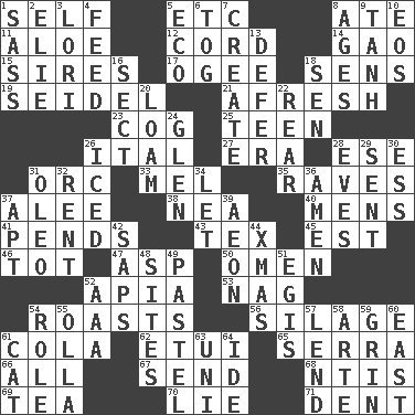 ACROSS 1. Oneself 5. And so on (abbr.) 8. Had dinner 11. Medicinal plant 12. Drawstring 14. E Mali city 15. Founders of families 17. Double curve, resembling the letter S 18. Elected reps. 19. A glass for beer 21. Anew 23. Gear tooth 25. Adolescent 26. Slanted text style (abbr.) 27. Period 28. Compass dir. 31. The grampus (Milton) 33. Cartoonist voice _ Blanc 35. All-night dance parties 37. Toward shelter 38. Teachers' org. 40. Not women's 41. Depends 43. John Ritter's dad 45. Eastern Standard Time (abbr.) 46. Small child 47. Cleo's killer 50. Sign of things to come 52. Capital of Western Samoa 53. Tired old horse 54. Cooks with dry heat, as in an oven 56. Fodder prepared in a silo 61. Root beer relative 62. Needle holder 65. Spanish missionary in California 66. 100% 67. Transmit 68. Nuclear Threat Initiatives 69. Beverage made from leaves 70. Falsehood 71. Gouge DOWN 1. Backtalk 2. Writer Wiesel 3. Australian parrot (variant) 4. Nourish 5. Environmental prefix 6. Coat; cloak 7. Make 8. Eras 9. Hyperbolic tangent 10. Greek goddess of the dawn 13. Postpone 16. Religious group 18. Elected rep. 20. Rich soil 22. Located in or toward the back 24. Small, secluded valley 26. On the rocks 28. Nights before holidays 29. Transmitted 30. Curvy letter 31. Margarine 32. Monthly bill 34. Allow 36. So be it 37. Fitting 39. Age 42. Plant excrements 44. Dec. holiday 48. Locates 49. Soft color 51. Armor plate that protects the chest 52. Auto club (abbr.) 54. Hero or heavy, e.g. 55. Water jar 57. Grant temporary use of 58. Johnson of "Laugh-In" 59. Broad smile 60. 90 degrees 61. Feline 63. Single; one (prefix) 64. Binary compound