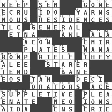 ACROSS 1. Shed a tear 5. Elected rep. 8. Went 12. Shade of tan 13. Wedding promise 14. Tall tales 15. Horse sense 16. Dwellings 19. Affectionate concern, for short 20. Commissioned military rank 21. Inactive volcano in Sicily 23. Leather borer 24. Wing 27. Age 30. Arab leader 31. Food holders 34. Grandmother 35. Frolic 38. Firearm 40. Those people 41. Toward shelter 42. A viewer who gazes fixedly 44. Be inclined (to) 45. Object of repulsion 46. Greek goddess of the dawn 47. Scottish cap 50. Tenth: prefix 53. Speakers 57. Adept person 59. Supplementary 63. Entreaty 64. Related on the mother's side 65. Modern: prefix 66. Charged particles 67. Opera by Verdi 68. Followers of ems 69. One of the Great Lakes DOWN 1. Gone 2. Learning spot: Fr. 3. Spew [out] 4. Tenth month of the Hindu calendar 5. Beget 6. Genesis locale 7. Characteristic smell of wine 8. Separate the seeds from cotton 9. The grampus (Milton) 10. Compass dir. 11. Curvy letter 14. Shout 17. Lyricist Gershwin 18. Simpleton 20. Highlander 22. Slept 24. Nanny 25. Actor's bit 26. Like ___ of sunshine 28. Boat paddle 29. Nuclear Threat Initiatives 30. Main course 32. Bank Draft (abbr.) 33. Thick slice 35. Assign a rank or rating to 36. Margarine 37. Not women's 39. Period 43. Conclusions 47. Lacquered or enameled metalware 48. "We ___ not amused" (Victoria) 49. Floor protector 51. Bodily heat indicating an inflammation 52. Ancient Celtic tribe of eastern Britain 54. Prong on a fork 55. Baking chamber 56. Vintage cars 58. Relaxation 59. Ocean 60. University (slang) 61. Groovy apt. 62. Parent Teacher Assoc. 63. Sliced dessert