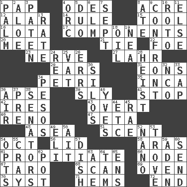 ACROSS 1. Infant food 4. Lyric poems 8. 43,560 square feet 12. Having or resembling wings 14. Court order 15. Instrument 16. Globular water bottle used in Asia 17. Parts 20. Rendezvous 21. Make a knot 22. Enemy 23. Boldness 27. Cowardly lion portrayer 29. Hearing organs 31. Immeasurably long periods of time 34. _ dish (used to culture cells) 35. South American Indian 36. Domed church section 39. Secret 41. Discontinue 42. Angers 43. Unconcealed 46. Former U.S. Attorney General Janet 47. Stalk of a moss capsule 48. Toward the sea 51. Odor 54. Sep. follower 56. Hat (slang) 58. Ancient river in northeast Turkey 61. Conciliate 66. Thickened enlargement 67. Pacific island yam 68. Glance over 69. Baking chamber 70. System (abbr.) 71. Equivocates 72. Conclude DOWN 1. Inside of hand 2. Medicinal plant 3. Eucharist need 4. The grampus (Milton) 5. Superhero pair 6. Shade tree 7. Back-to-school mo. 8. Had dinner 9. Meet 10. Printing process, for short 11. Otherwise 13. Pace 18. Petroleum 19. Teachers' org. 24. Portuguese money of account (variant) 25. Large container 26. Blunders 28. Robbery 30. Grain storage towers 32. Non-commissioned officer (abbr.) 33. Plant excrement 34. Mexican monetary units 36. Wind 37. Before (prefix) 38. Legislators 40. Jacques Cousteau's middle name 44. And so on (abbr.) 45. Actress Charlotte 49. Biblical high priest 50. Small island 52. Billionth: prefix 53. Collection of objects 54. Chooses 55. Supercomputer manufacturer 57. Food container 59. Arabian gulf 60. Transmit 62. Cooking vessel 63. Adept person 64. Scottish cap 65. Followers of ems