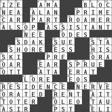 ACROSS 1. Ending with capital 4. Housemaid (var.) 7. Alliance 11. Teachers' org. 12. Actor Alda or Thicke 13. A-one 14. Auto 15. Component 16. Wanderer 17. Columnist Joseph or Stewart 19. Helper 21. Born 23. Lyric poems 24. Neighbor of Neb. 25. Institute legal proceedings 26. R.R. building 29. Dinah or Pauly 30. Double-curved letter 31. Part of HMS, perhaps 32. What Jean-Claude Killy likes to do 33. Before (prefix) 34. Mouth or opening 35. Boat paddle 36. Ewer handle 37. Disorder 40. Baseball player Mel 41. "One Day ___ Time" 42. Part of Q.E.F. 43. Old wives' tales, e.g. 45. Greek goddess of the dawn 46. Home 51. Boldness 55. Spoke pompously 56. Monthly bill 58. Small island 59. Carrier 60. Margarine 61. The 19th letter of the Greek alphabet 62. SW Saudi Arabia district 63. Pacific Standard Time (abbr.) 64. Biblical high priest DOWN 1. South American Indian 2. Ardor 3. Hearing organs 4. According to 5. Hindu Mythology: god of death 6. Pismires 7. Naughty children 8. Pale green bean 9. Sign of something about to happen 10. Sure thing 12. Seem 13. Airs 16. Amusement-park features 18. Southwest Nigerian state 20. Boozer 22. Supplement with great effort 24. Chest covering 25. Spanish missionary in California 26. Yell 27. Become fatigued 28. White ___ sheet 29. Three-handed card game 32. "Barney Miller" actor Jack 33. Eucharist need 36. Having ears or earlike features 37. Observe 38. Right away 39. To erase 43. 61 cubic inches 44. Baltic tributary 46. Roll call or roster of names 47. Greek god of love 48. Suttee (variant) 49. Riding implement 50. Snakelike fish 52. Pace 53. Small bottle 54. Needle case 57. Fish or hair follower