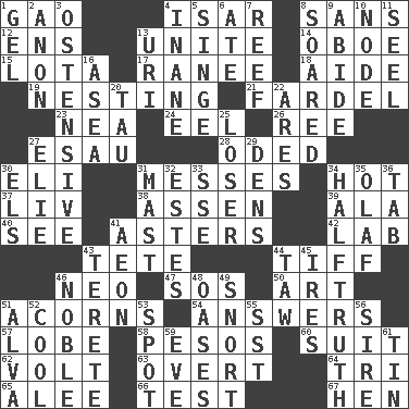 ACROSS 1. E Mali city 4. Austrian river, tributary to the Danube 8. Without 12. Followers of ems 13. Join together 14. Mitch Miller's instrument 15. Globular water bottle used in Asia 17. The wife of a rajah (variant) 18. Assistant 19. Inhabiting a nest 21. Bundle 23. Teachers' org. 24. Snakelike fish 26. Portuguese money of account (variant) 27. He sold his birthright 28. Wrote a lyric poem 30. Connecticut Ivy Leaguer 31. Makes clutter 34. Being at a high temperature 37. 54 in ancient Rome 38. NE Netherlands city 39. Insect wing 40. Observe 41. Michaelmas daisies 42. Experiment locale 43. False hair 44. Small quarrel 46. Modern: prefix 47. Mayday 50. Tate display 51. Oak nuts 54. Replies 57. Ear part 58. Mexican monetary units 60. Set of matching outer garments 62. Electrical Unit 63. Unconcealed 64. Three (prefix) 65. Toward shelter 66. Trial 67. Layer DOWN 1. Set 2. Soon (poet.) 3. Clearly or manifestly demonstrative 4. Lacking in sense or substance 5. Burn superficially 6. Had dinner 7. Coral ridge 8. Flew 9. Tolerate 10. Thickened enlargement 11. Sew up the eyelids of hawks and falcons 13. RI univ. 16. At sea 20. The 19th letter of the Greek alphabet 22. Ancient Greek god of war 25. Failure 27. Writer Wiesel 29. Hiding places for outlaws 30. Raised railways 31. Vertical spar for supporting sails 32. _____ Park, CO 33. Compass dir. 34. Not exactly gospel 35. Norwegian king 36. Keyboard key 41. Age 43. Cigar-shaped 44. The 23rd letter of the Hebrew alphabet 45. Angers 46. Having high moral qualities 48. Fertile tracts in a desert 49. Derisive sound 51. Inventor's middle name 52. Calm and collected 53. Specific locale 55. Fast jet (abbr.) 56. The founder of a family 59. Night before a holiday 61. Metal container