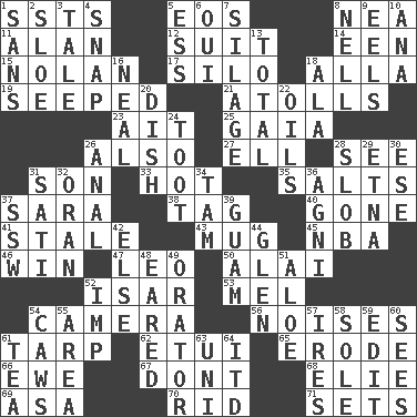 ACROSS 1. Fast planes 5. Greek goddess of the dawn 8. Teachers' org. 11. Actor Alda or Thicke 12. Set or collection 14. Car or cant ending 15. Pitcher Ryan 17. Grain storage tower 18. Silent film actress Nazimova 19. Oozed 21. Ringlike coral islands and reefs 23. Small island 25. Greek goddess of the earth (variant) 26. In addition 27. Pipe bend 28. Perceive with the eye 31. Male offspring 33. Being at a high temperature 35. Table seasonings 37. "Two Mules for Sister ____" 38. Label 40. Went 41. Lacking originality or spontaneity 43. Java container 45. Basketball assoc. 46. Victory 47. Lion 50. Jai _ 52. Austrian river, tributary to the Danube 53. Cartoonist voice _ Blanc 54. Device for capturing images 56. Annoying sounds 61. Canvas cover 62. Needle case 65. Eat (away) 66. She-sheep 67. Do not 68. Writer Wiesel 69. White ___ sheet 70. To free from 71. Arranges properly for use DOWN 1. Without 2. _ gin 3. Story 4. Fastener 5. Double-curved letter 6. Fr. "Yes" 7. Fodder prepared in a silo 8. 1994 drama film starring Jodie Foster 9. Snakelike fish 10. Santa ___, CA 13. "_____ Recall" 16. Actress Patricia 18. In the manner of 20. Food container 22. Lubricates 24. A blast of a horn 26. Of or related to the anus 28. Messy guy 29. Inactive volcano in Sicily 30. Compass dir. 31. Suttee (variant) 32. Northwest Algerian city 34. Scottish cap 36. Hindu god of fire 37. Compass dir. 39. Island territory of the United States 42. Otherwise 44. Small, secluded valley 48. Having ears or earlike features 49. Speaker 51. Medicinal plant 52. Mischievous child 54. Crow sounds 55. Length times width 57. Angers 58. Flatfish 59. Prepare for publication 60. Observes 61. Afternoon social gathering 63. Corn or form start 64. It would