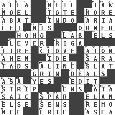 ACROSS 1. Silent film actress Nazimova 5. Famous astronaut Armstrong 9. The 23rd letter of the Hebrew alphabet 12. Christmas carol 13. Haul 14. Greater amount 15. Blind as ____ 16. Southeast Asian peninsula 17. Operatic vocal solo 18. Allow 19. Mountains (abbr.) 21. Abalone 22. Same (prefix) 24. Experiment locale 26. Raised railways 27. Crowbar 28. Capital of Latvia 29. Become fatigued 30. Garlic unit 32. Smallest unit of an element 36. So be it 37. Binary compound 38. "Two Mules for Sister ____" 39. Small boys 40. Place in a line 42. Narrow board 43. Amused look 44. Allots cards 46. White ___ sheet 49. Consenting reply 50. Prepare for publication 51. Empty completely 53. Followers of ems 54. "One Day ___ Time" 57. Ketch in the Levant 58. Coast Guard woman 61. Enthusiasm 62. Otherwise 63. Elected reps. 64. San ____ (Riviera town) 65. Born 66. 4th largest of the Great Lakes 67. At sea DOWN 1. Of or related to the anus 2. Ear part 3. Tough but pliablecoriaceous 4. Keyboard modifier key 5. Nuclear Threat Initiatives 6. A really long time 7. It would 8. Lion 9. Singer Mel 10. Satellite of Uranus 11. Puts on (as clothing) 14. Spoil 19. Madame (abbr.) 20. Torque (variant) 21. Chief or king in Benin or Nigeria 23. Baking chambers 24. Make or become more lively 25. Personal question 27. Pale green bean 28. "The Thinker" sculptor 29. Make lace 31. Ms. Damita and namesakes 32. Slender Brazilian palm 33. Baron Munchausen's specialties 34. Mouths or openings 35. Floor protector 40. "We ___ not amused" (Victoria) 41. Paradise 43. Flimflam 45. Begley and Asner 46. NE Netherlands city 47. Showing deterioration from age 48. Get up 52. Frozen water 53. Celtic language 55. Not wild 56. Small Philippine buffalo 58. Compass dir. 59. For each 60. Cuckoo 61. Epoch
