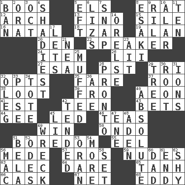 ACROSS 1. Expressions of contempt or scorn 5. Raised railways 8. Part of Q.E.F. 12. Bowlike part 13. A pale, very dry sherry 15. Filth; sediment 16. Relating to or accompanying birth 18. Czar 19. ____ Jay Lerner 20. Lair 22. Orator 24. A distinct part 26. Cards in a Roman deck? 27. Son of Isaac 28. Pacific Standard Time (abbr.) 29. Three (prefix) 32. Elects 35. Conductor's collection 37. Friend of Pooh 38. Spoils 39. From 40. Period of immesurable duration 41. Eastern Standard Time (abbr.) 42. Adolescent 43. Stakes 44. Unit of force equal to gravity 45. Directed 46. Afternoon social gatherings 49. Victory 50. Southwest Nigerian state 51. Mood resulting from idleness 55. Snakelike fish 56. Ancient Persian 57. Greek god of love 59. Unclothed pictures 63. Actor Baldwin 64. Have the gumption 65. Hyperbolic tangent 66. Keg 67. Fish or hair follower 68. Whirlpool DOWN 1. Prohibit 2. Mouth or opening 3. Sep. follower 4. Most dark, concealed or hidden 5. Newt 6. Belonging to Elizabeth 7. Fastener 8. 1973 Nobel Price Winner (Physics) Leo 9. Cause heat under the collar 10. Having or resembling wings 11. Nine, plus one 14. Threatening words 17. Allows 21. Teachers' org. 23. Small island 25. Bungled 28. Right away 29. Family _ (genealogy) 30. Carrot, for example 31. Charged atoms 32. Cassini of fashion 33. Airs 34. Lug 36. "We ___ not amused" (Victoria) 40. Utter; complete 42. Watched over 45. Untruth 47. Compass dir. 48. Arabian gulf 49. Raze 51. Actor Lugosi 52. Lyric poems 53. NW Algerian seaport 54. Greater amount 56. Apple computer (short form) 58. Put into a specified state 60. Male parent 61. Conclude 62. Like a shrinking violet