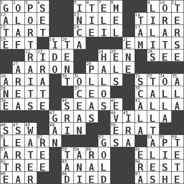 ACROSS 1. Republicans 5. A distinct part 9. Car dealer's back yard 12. _ vera 13. The longest river in the world 14. Become fatigued 15. Small pie 16. To provide with a ceiling 17. Having or resembling wings 18. Bank Draft (abbr.) 19. Call ___ day 21. Sends forth 22. Travel on or in a vehicle 24. Layer 26. Perceive with the eye 27. Composer Copland 28. Light colored 29. Operatic vocal solo 30. For Whom the Bell _____ 32. Portico 36. Remaining after all deductions 37. Corporate head (abbr.) 38. Give a ring to 39. Relaxation 40. Gospel singer Marvin 42. Silent film actress Nazimova 43. Pate de foie ____ 44. Country residence 46. Compass dir. 49. The 18th letter of the Arabic alphabet 50. Part of Q.E.F. 51. Acquire or gain knowledge or skills 53. Girls' org. (abbr.) 54. Fitting 57. Johnson of "Laugh-In" 58. Pacific island yam 61. Writer Wiesel 62. Relationship diagram 63. Of or related to the anus 64. Remainder 65. Ewer handle 66. Passed on 67. American tennis player Robert DOWN 1. Yard entry 2. Norwegian king 3. Likenesses of persons 4. Put into a specified state 5. South American Indian 6. Make a knot 7. Biblical high priest 8. Cartoonist voice _ Blanc 9. Ms. Damita and namesakes 10. Speak pompously 11. Laconic 14. Scottish cap 19. Wedding promise 20. Portable shelter 21. Compass dir. 23. Feeling or showing extreme anger 24. Rings 25. Raised railways 27. Length times width 28. Entreaties 29. A saturated hydrocarbon 31. Sea 32. Any of the three canals of the cochlea 33. Baron Munchausen's specialties 34. Rounded earthenware pot or jar 35. Wing 40. _ Lanka 41. Nights before holidays 43. Separate the seeds from cotton 45. Lyricist Gershwin 46. Schedule 47. Father Junipero _ 48. Wetness 52. Portuguese money of account (variant) 53. Aureate 55. Expression of disdain 56. Wig 58. Small amount or degree 59. Black tropical American cuckoo 60. Actress Charlotte 61. Epoch