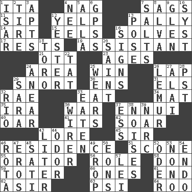 ACROSS 1. Call ___ day 4. Tired old horse 7. Droops 11. Small drink 12. Sharp bark 13. Chummy 14. Tate display 15. Snakelike fish 16. Finds the solution 17. Musical pauses 19. Helper 21. Baseball player Mel 23. Eras 24. Type of rug 25. Acquire through effort 26. Infant locale 29. Derisive sound 30. Followers of ems 31. Raised railways 32. Actress Charlotte 33. Erode 34. Floor covering 35. Retirement account (abbr.) 36. Armed conflict 37. World-weariness 40. Boat paddle 41. It is 42. Fly high 43. Old wives' tales, e.g. 45. Title for a knight 46. Home 51. Biscuitlike quick bread 55. Speaker 56. Hero or heavy, e.g. 58. Spanish title 59. Carrier 60. Washington bills 61. Conclude 62. SW Saudi Arabia district 63. 23rd letter of the Greek alphabet 64. Friend of Pooh DOWN 1. Austrian river, tributary to the Danube 2. Hoop that covers a wheel 3. Flats, for short 4. Born 5. Silent film actress Nazimova 6. Global Positioning Systems (abbr.) 7. Table seasonings 8. Inventor's middle name 9. Small, secluded valley 10. System (abbr.) 12. Last 13. Introduce or present, as a question 16. Omens 18. "Corrida" creature 20. Virtuous person 22. Make lace 24. Approach 25. Erodes 26. Arboreal primate 27. Jai _ 28. Pacific Standard Time (abbr.) 29. "Two Mules for Sister ____" 32. _ de Janeiro 33. Ingested 36. One who wires 37. Double-curved letter 38. Annoying sounds 39. Drug cop 43. 61 cubic inches 44. Scent 46. Round or rotation of duties 47. Greek god of love 48. Suttee (variant) 49. Riding implement 50. Immeasurably long periods of time 52. Baltic tributary 53. Words to Nanette 54. Inside; within (prefix) 57. Flowery wreath